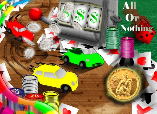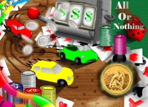 all or nothing=a micro machines rip off which a very innovative twist,instead of racing for first or last place,collection and gambling were more decisive factors to victory.it`s set in a casino.