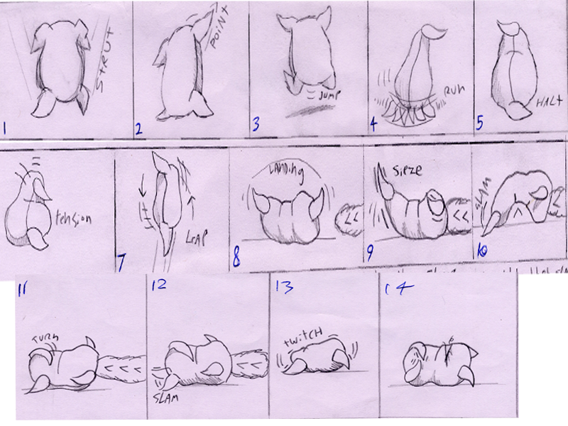 for the storyboarding phase of the flour sack, everyone went with really tame, cutesy ideas such as it picking a flower of the ground or uninspired slapstick like it being emptied into a flour bowl.
