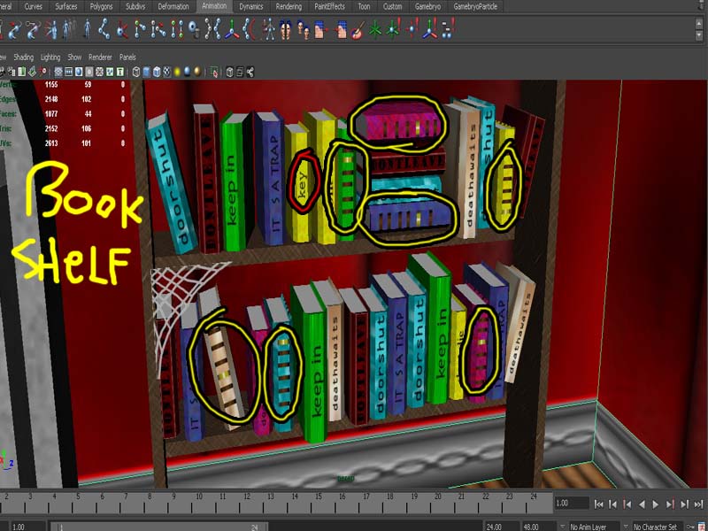 when the vase falls off the shelf and hits the floor a note written in blood will have the words “book” on it. and if the player remembers the note from earlier that will say…bookshelf! so lo and behold the player will take a look at the bookshelf and hopefully spot a new book that wasnt there previously. (see the previous bookshelf image, it`s the book that says `key` on it)