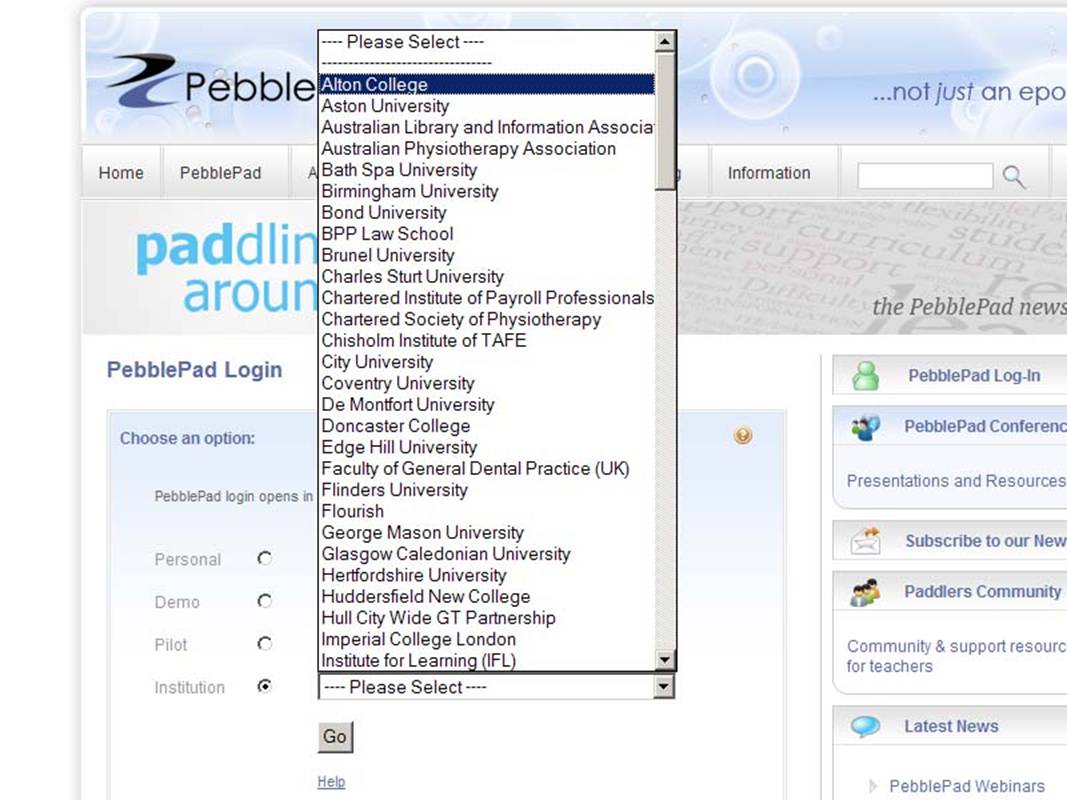 Instead of simply typing in my unique username and password I have to select an institution first. I had no idea so many companies were available! Pebblepad must really be thriving if so many people want to use it, it must be a better experience once I actually log in.