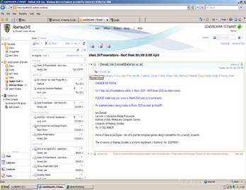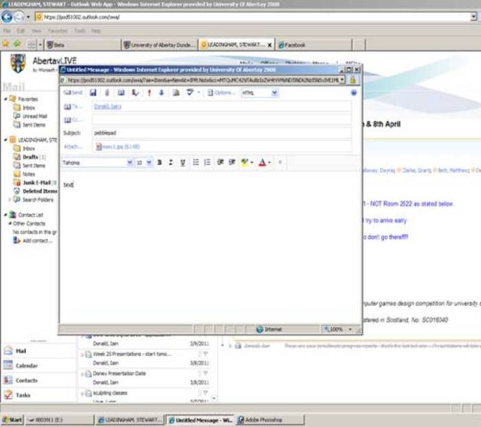 I would go into my Abertay webmail, easily done as the home page for internet explorer is the campus website. And smartly it doesn’t ask me to log in again since the service recognises which user is logged onto the machine. A small niggle when accessing emails from home.