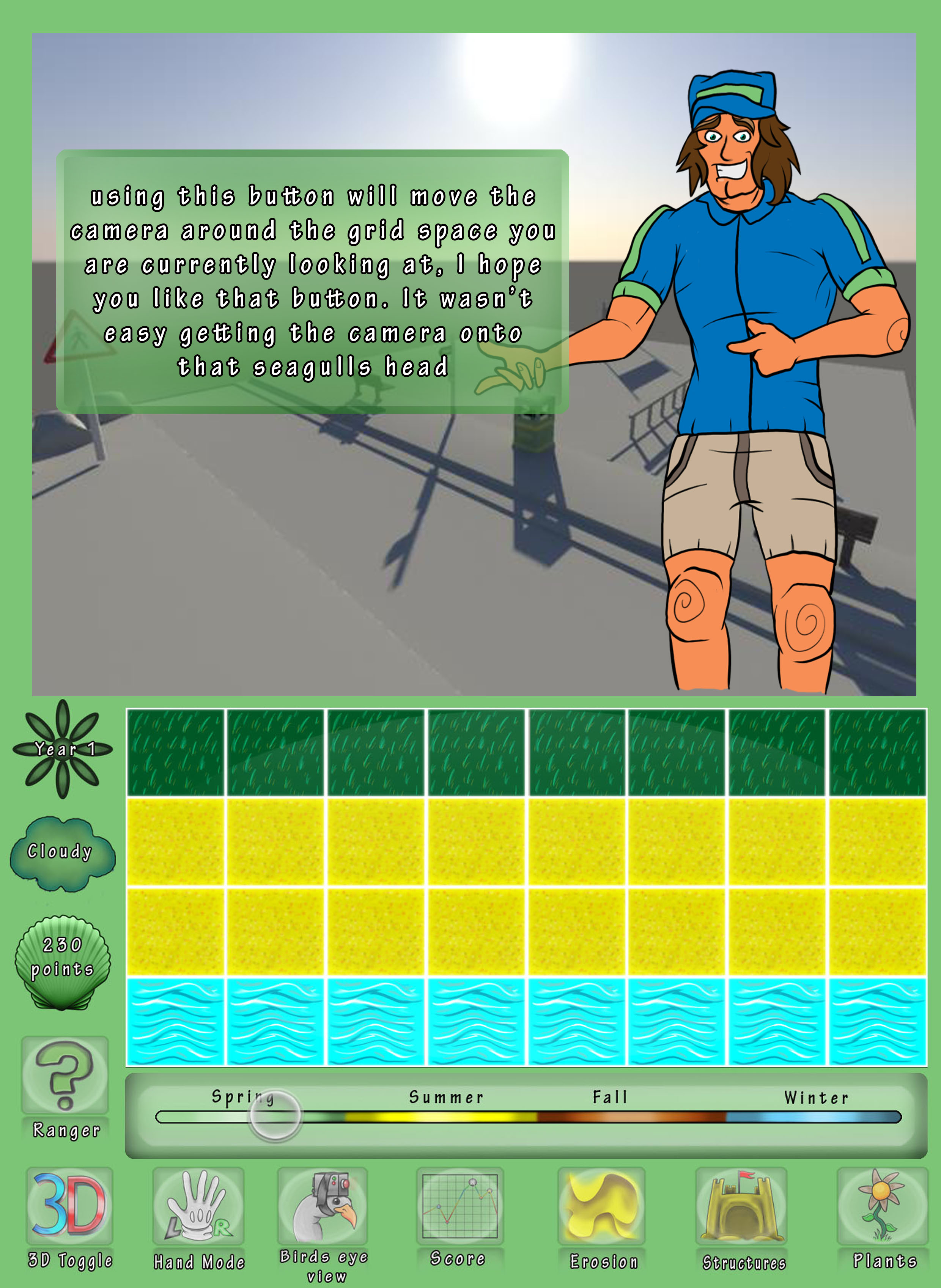 we presented everything thus far to the tutors and got some good feedback. there was a lot of clashing art styles, like with the sprites,semi realistic 3D and cutesy warden so were advised to reel everything in a bit.i did my part by recreating the map system from scratch. we got rid of animals from the game and made time manipulation a more prominent feature, whereas before to move time you had to go deep into the seasons sub menu. got rid of animals too, at the request of the 3D modelers quite understandably. another change was to simplify 3D navigation so we removed some of the camera controls in favor of preset cameras and instead of scrolling on the map to move the camera, simply touching grid squares would zap the camera there.