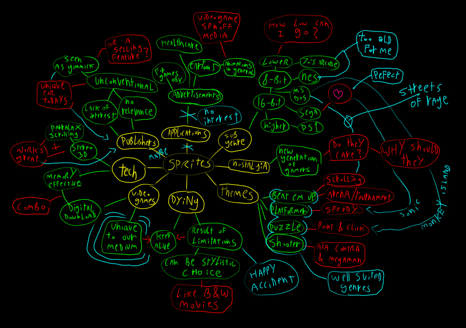 here is a mind map. i drew my central interest (sprites) stemming off into subtopics, and issues of relevance yadda yadda. i`ll go over the point`s that are worth going into more detail.