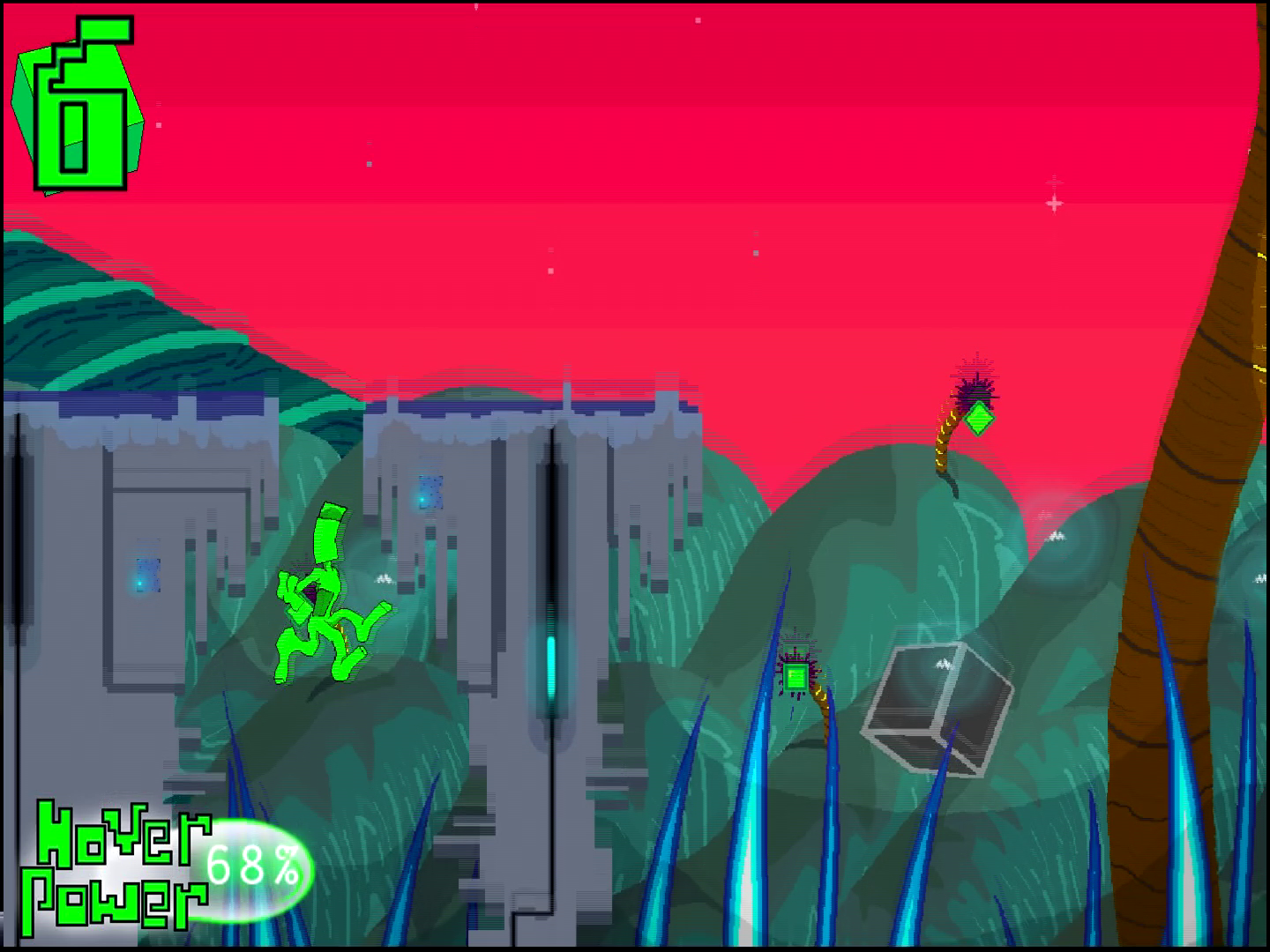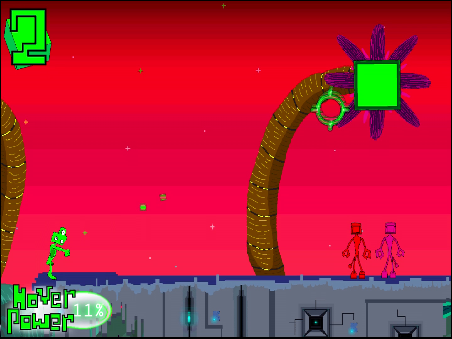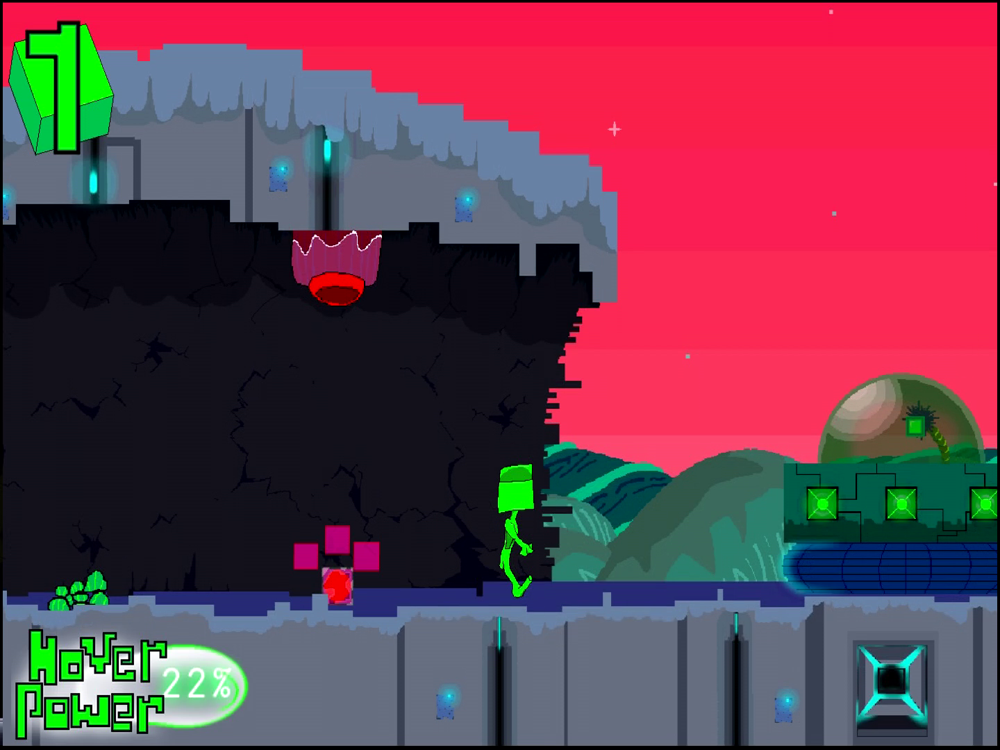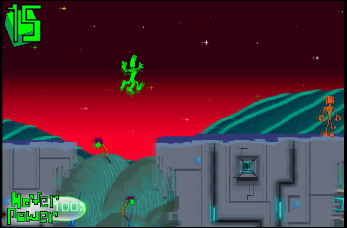 and try as he does, he doesn’t quite clear it and ends up respawning on the platform.his hover power is decreasing so there’s no point trying again. and again, I wish I had some more background elements here. the reds are fading together.