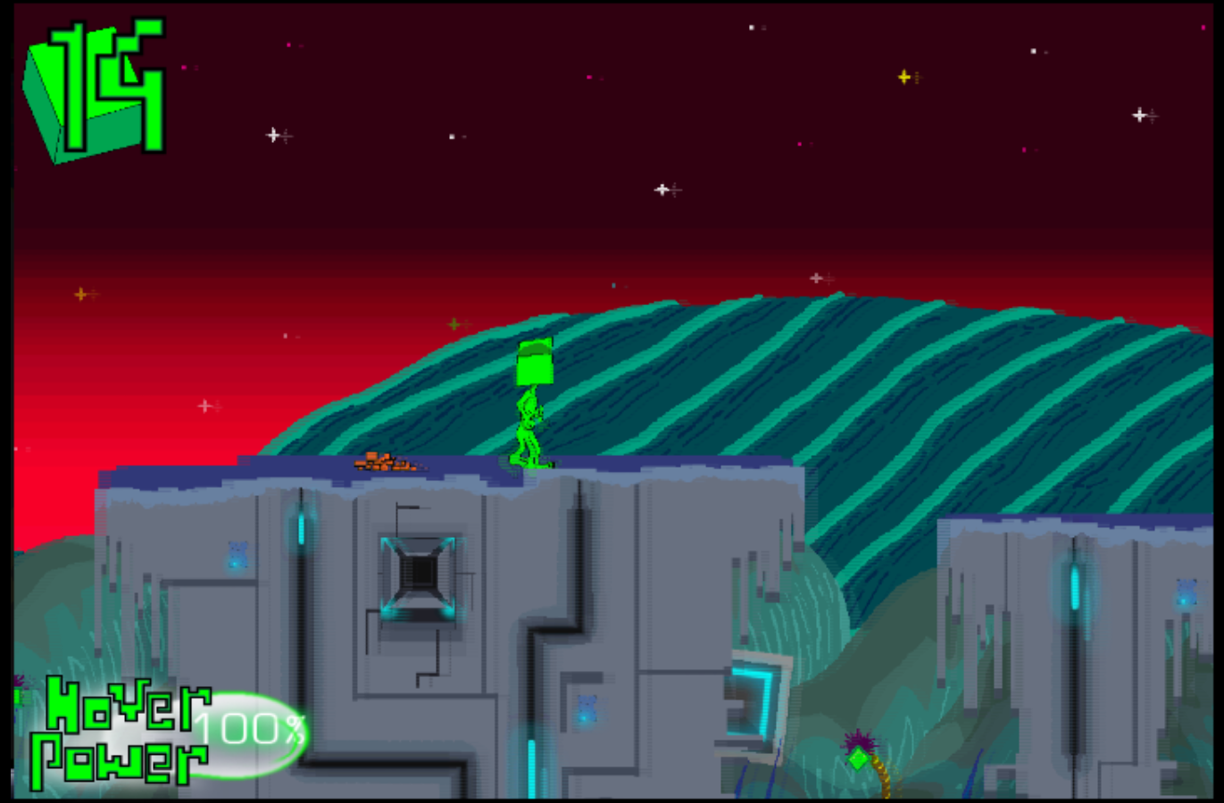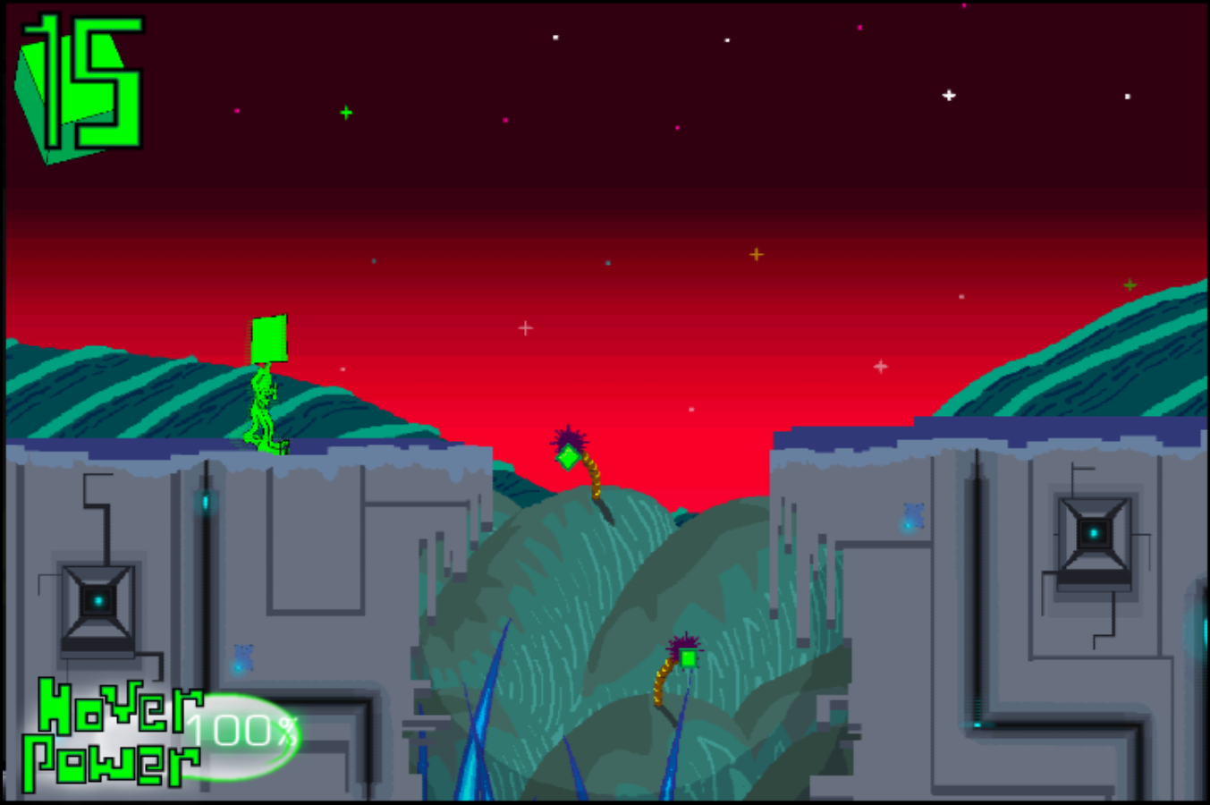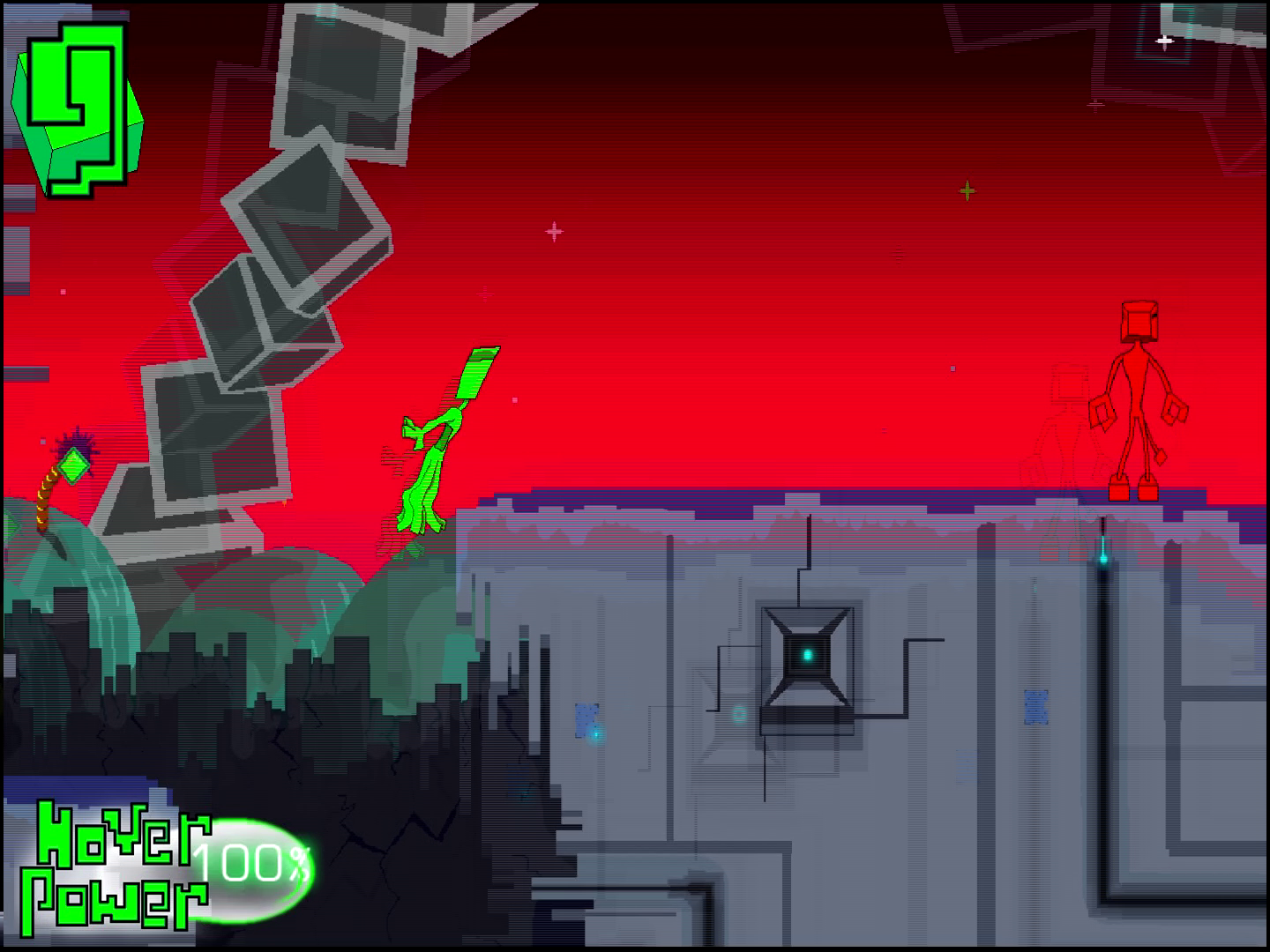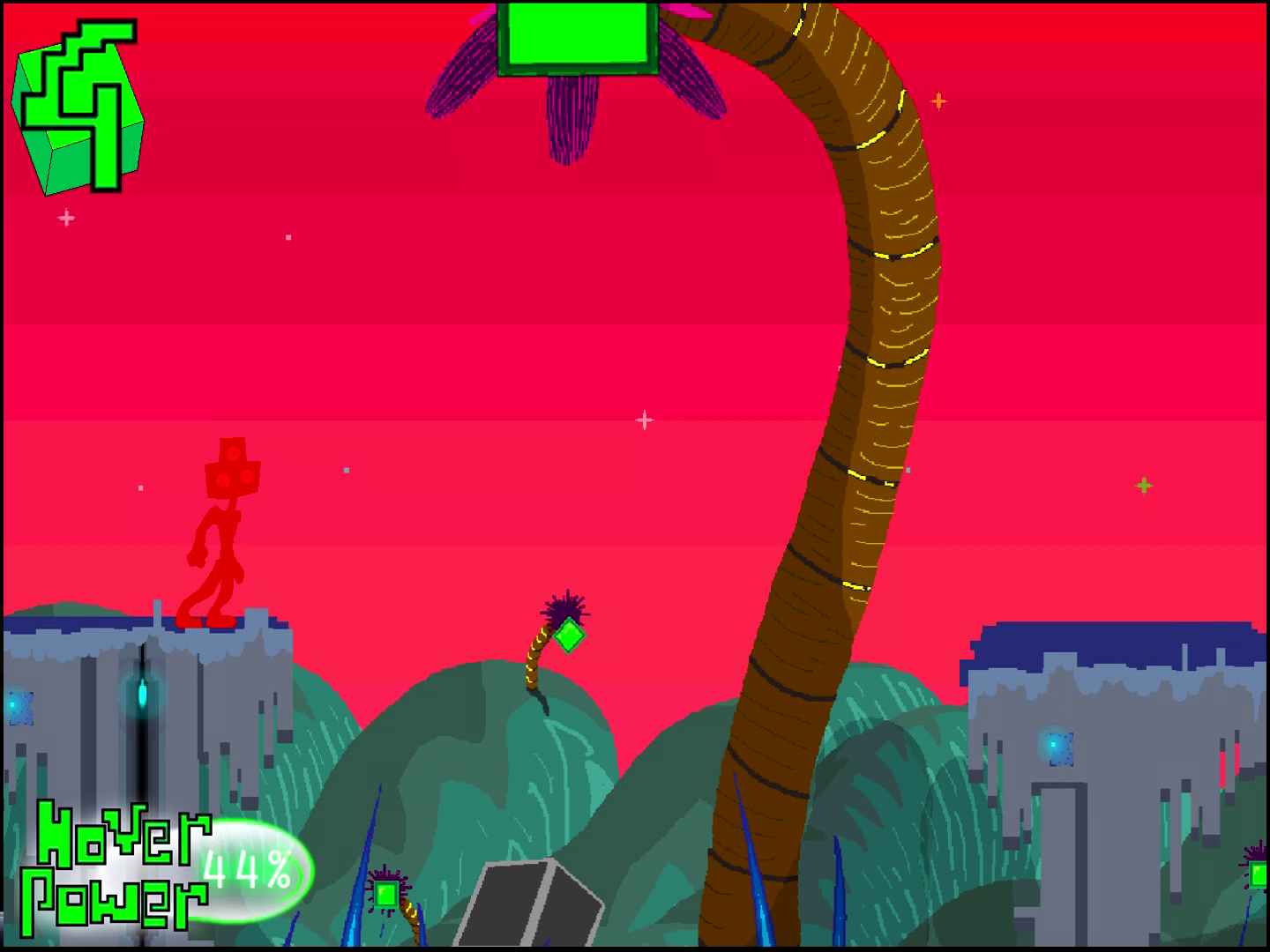 and try as he does, he doesn’t quite clear it and ends up respawning on the platform.his hover power is decreasing so there’s no point trying again. and again, I wish I had some more background elements here. the reds are fading together.