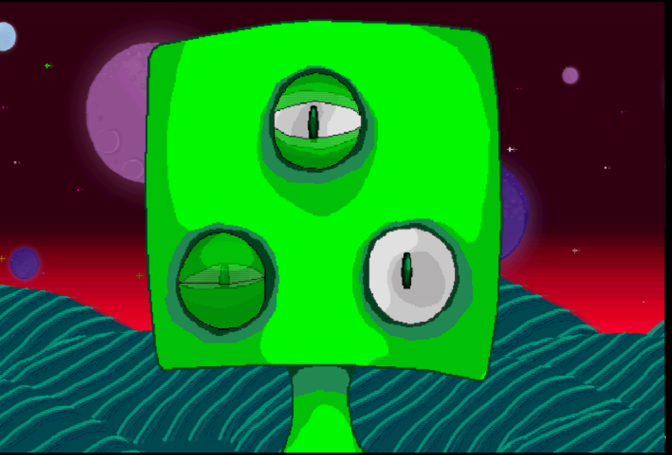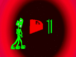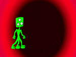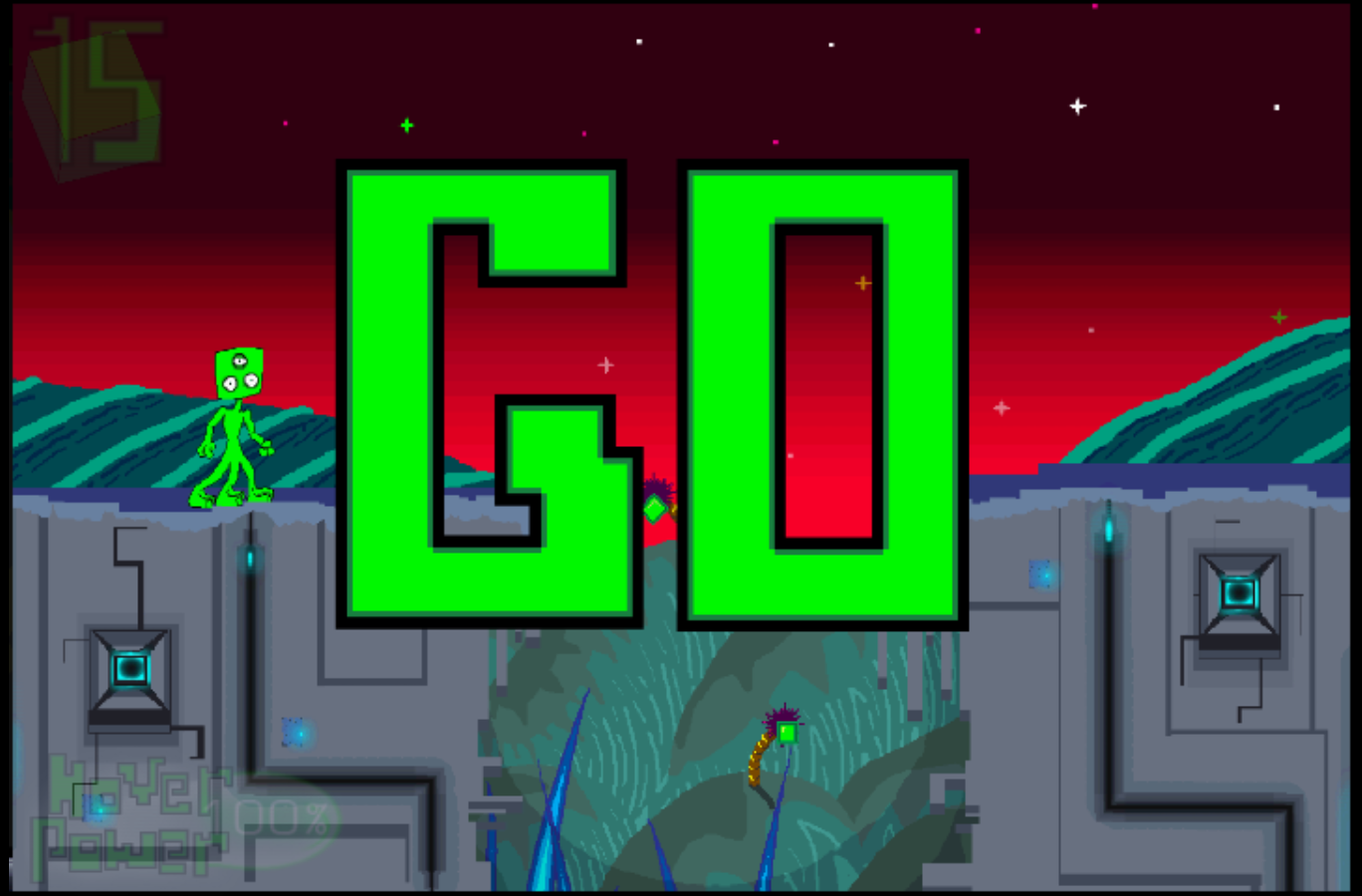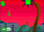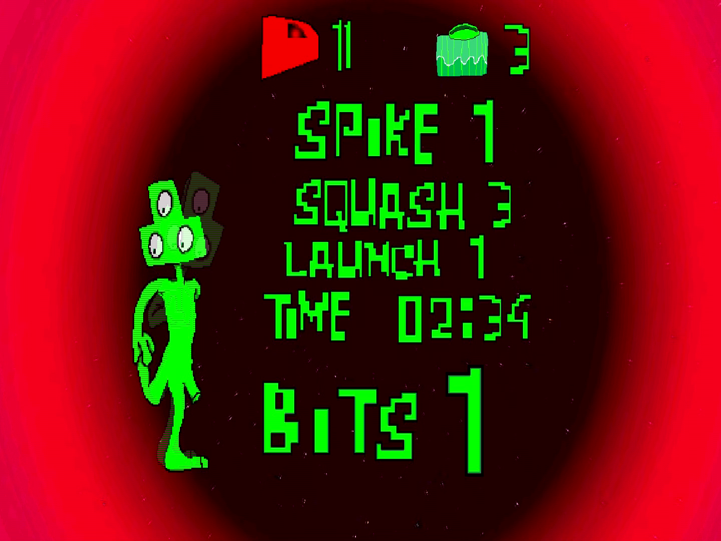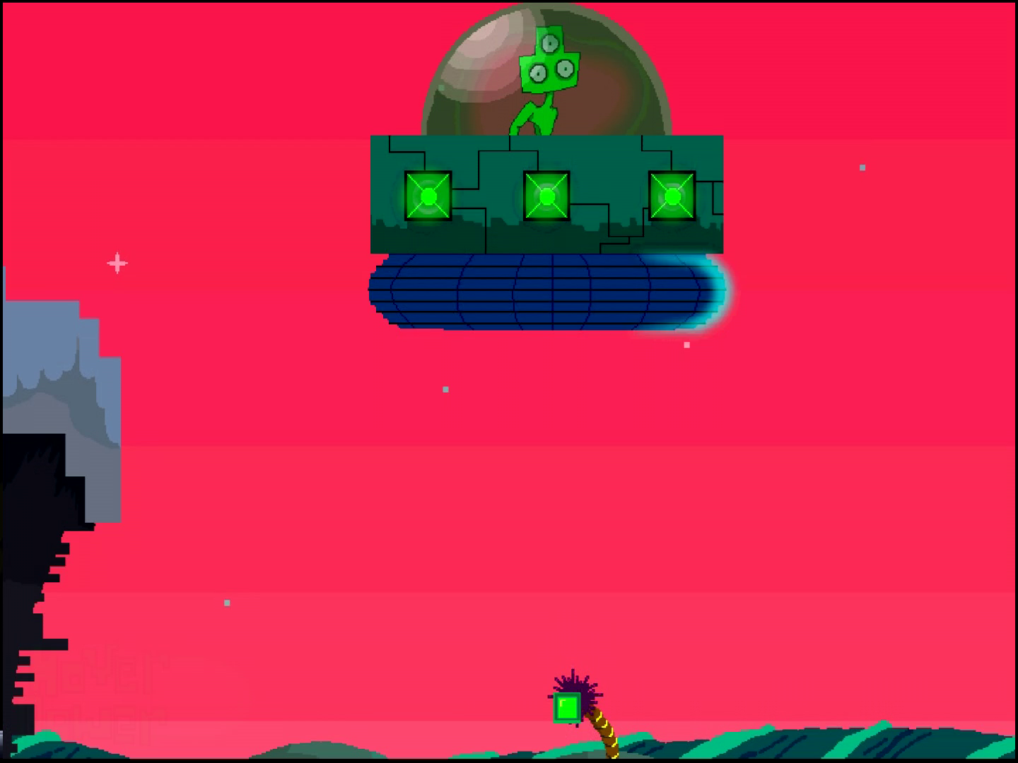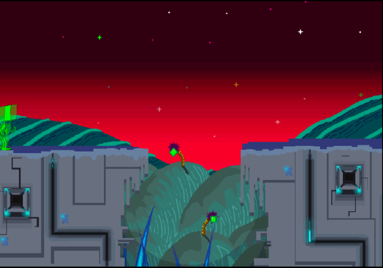 now this is here is Tixel teleported back on safe ground and flashing red to show he`s taken damage. I wish I could have gone back and changed this however, it contrasts with the background and more importantly it doesn’t play much with the aesthetic. my other idea was to have him rasterize to show he`s been hurt. like have his visual fidelity decrease for split second so he just looks like 3 green (different shaded) large pixels. it`s a visual trick i`ll be sure to employ in bit.cops.