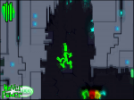 about to get out of cave. the music reverts back to normal as soon as he gets out. beforehand when speaking about the thin pulsing lasers, there`s also two more effects plastered all over the foreground. on the left there is a small blue rectangle with a smaller bright blue dot on it. this dot simply zap`s clockwise around the panel. slowly however as not to distract. it really was just a little filler animation. I wish I had made some of them rotate counterclockwise however. (the ones that were within range of each other) and changed the blue panel to look more like a computer chip.
