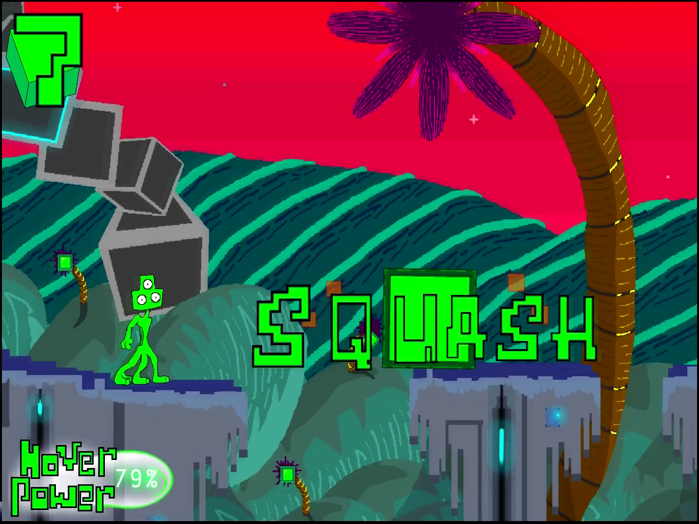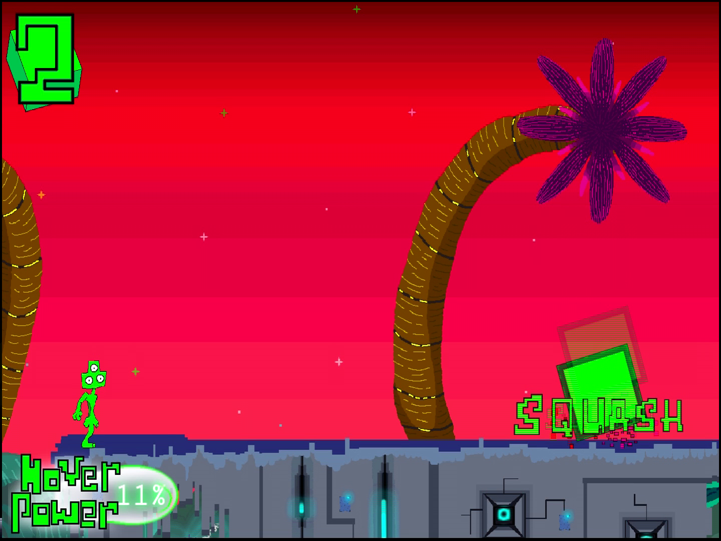 but since Tixel is running low on body parts, he just jumps to hit the treebox and set the double squash in motion. the first background layer comes into view quite nicely here. it was just 5 hills I drew arranged differently, along with blocks on them. some pulsing, some not.