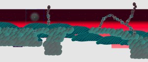 he`s defeated and now moving on. suppose nows as good a time as any to talk about the sky. I chose red because it introduced a very nice contrast between Tixel and the foreground elements (it clashes with one of the clawguys but lets not focus on that) the stars are simply 3 different icons, resized and recolored in various ways. I feel a little cheap and nasty using this technique to populate a level with visuals, but i`m only one person.