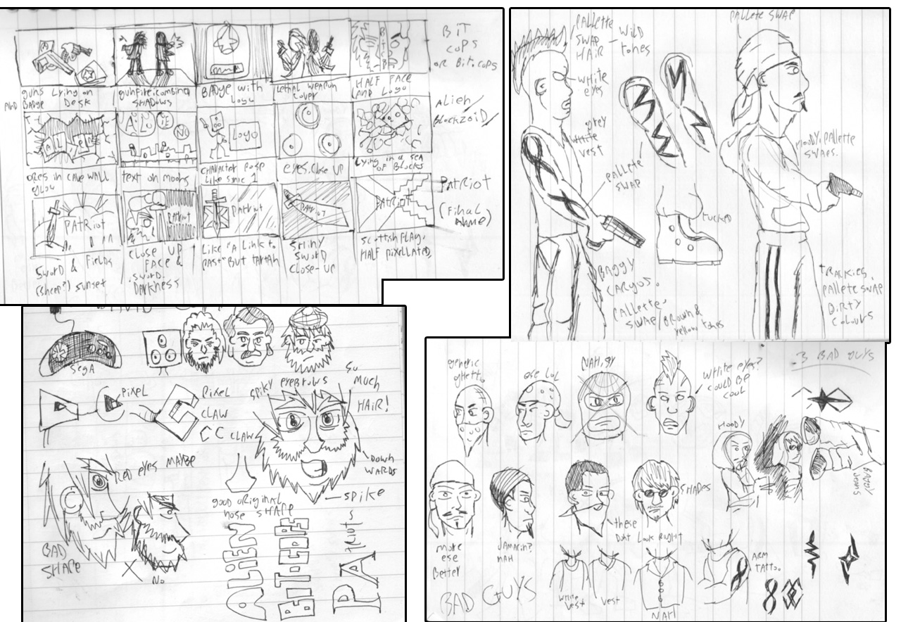 got some sketches with the bad guy designs, and some thoughts on my still-to-do boxarts of these theoretical games.