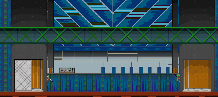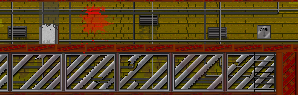 this is the second room. that metal pusher at the bottom is a hazard, and the table above can be flipped to make cover.