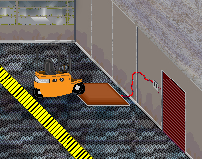 this is actually an extremely long hallway that’s going to be littered with boxes and bad guys. both players will jump on the fork lift and plow through, then park it on the switch to open the way forward.