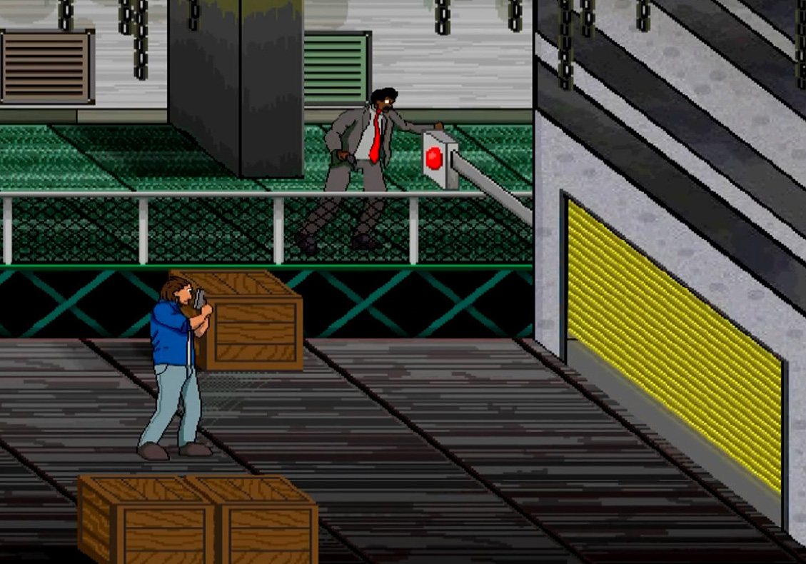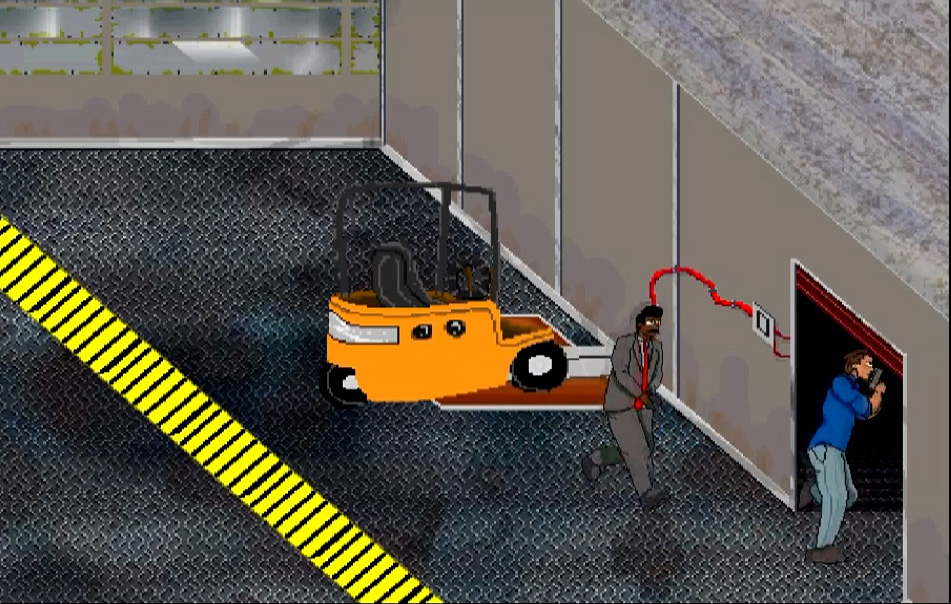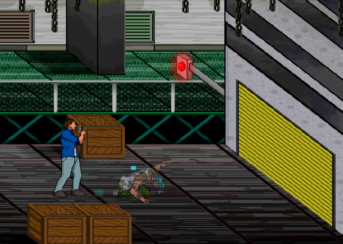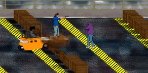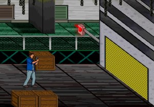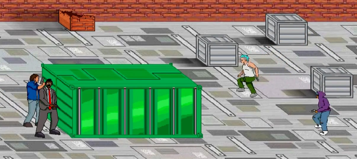 so once he`s been defeated, the cops take cover behind the box and the concrete wall to hide from incoming baddies. obviously on the way since that alarm/switch on the right has now lit up and is flashing (HD effects for it, since it is a major point of interest. looking back now, I should have made it even more obvious though, it`s kinda small)