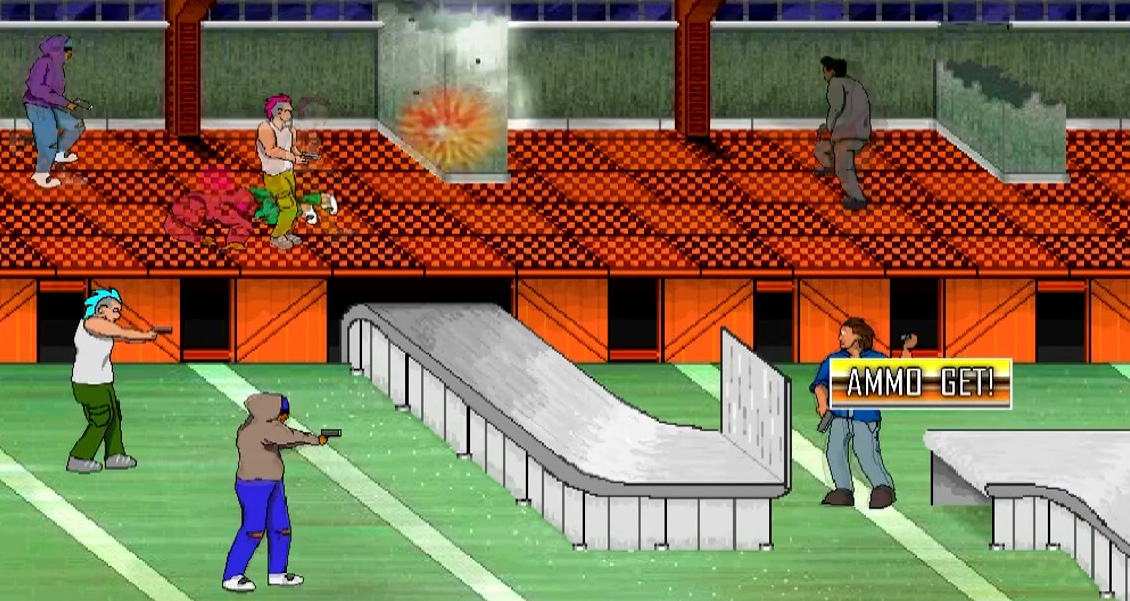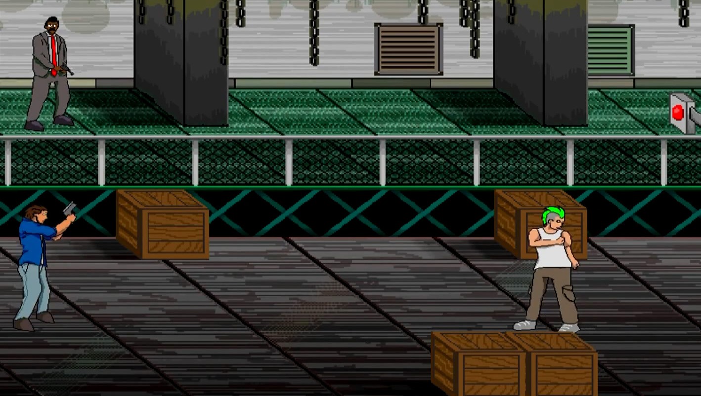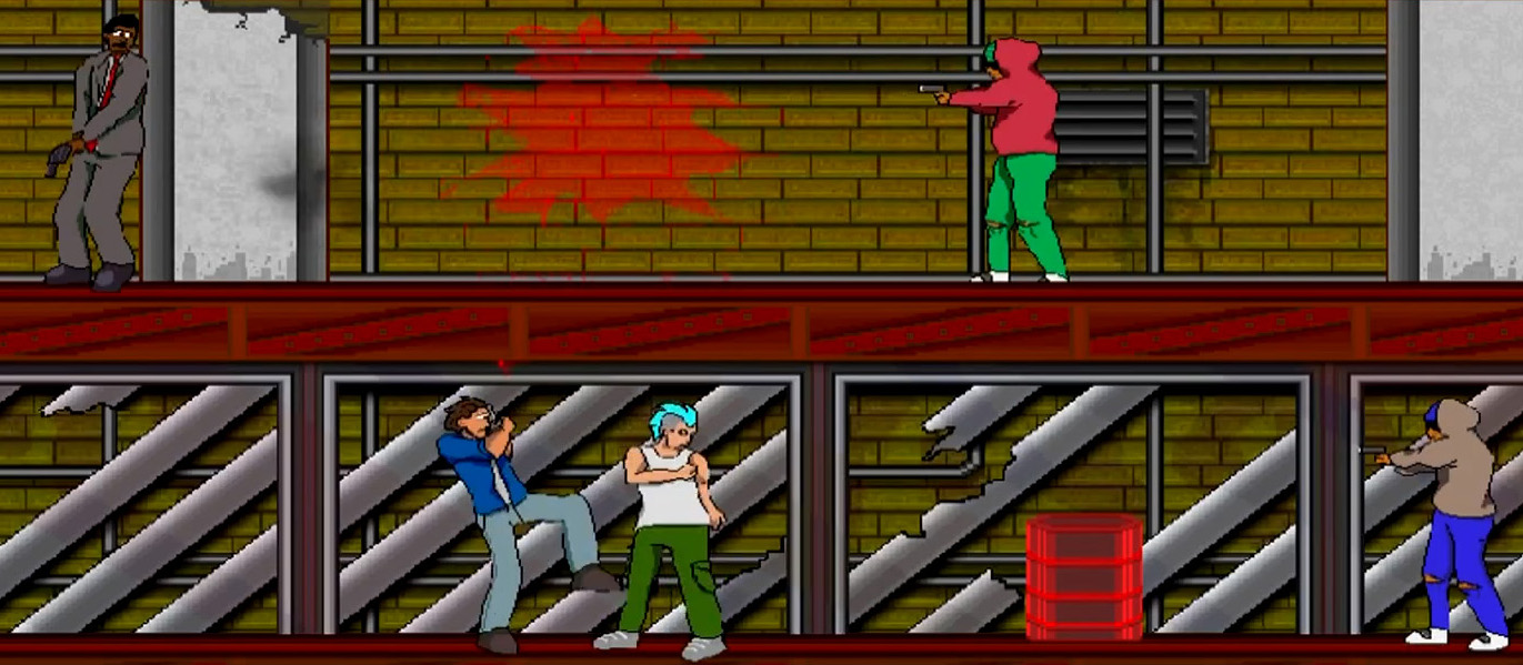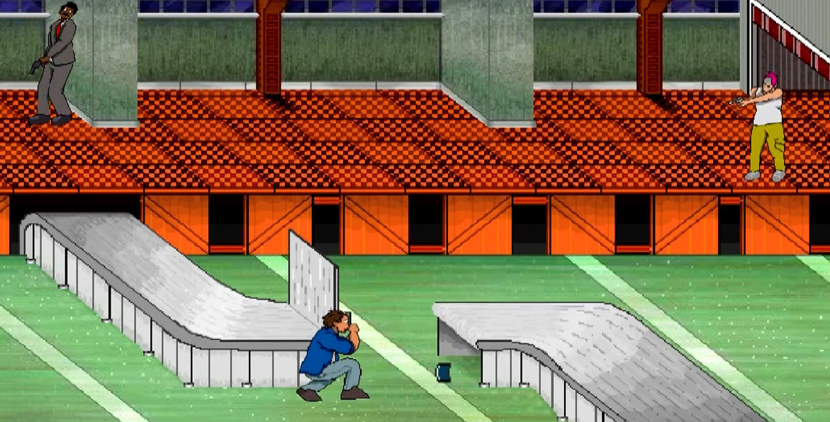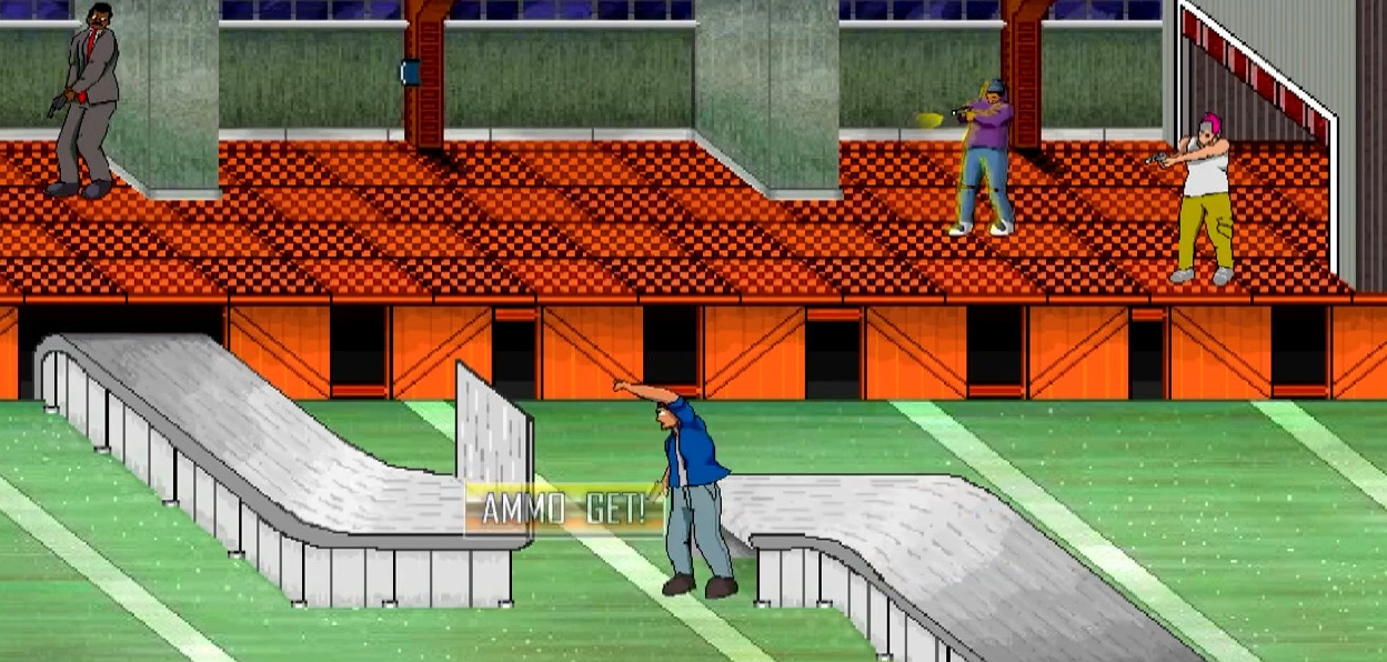 one of the thugs has been dealt with and john gets some ammo. the turquoise mohawk is also focusing his attention on the upper level, so john legs it towards to land a kick on the brown hoody thug.