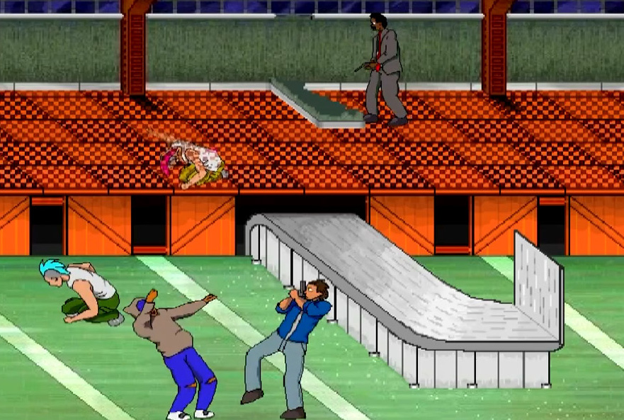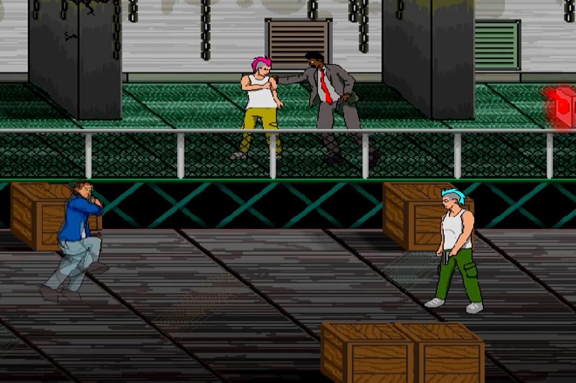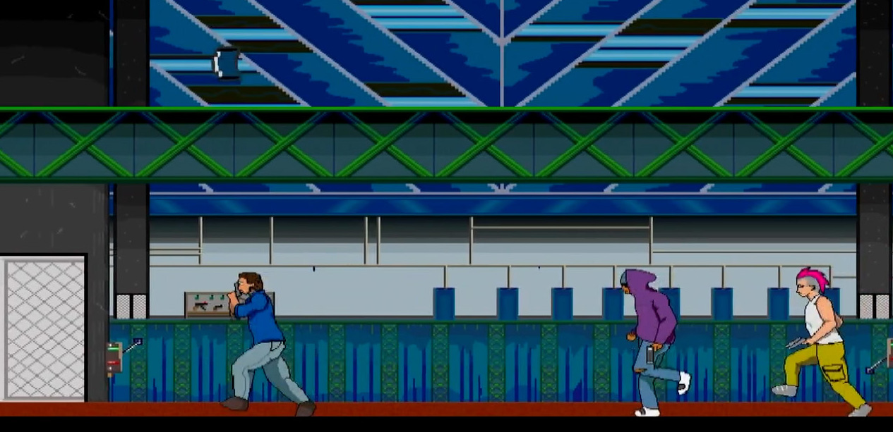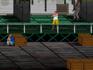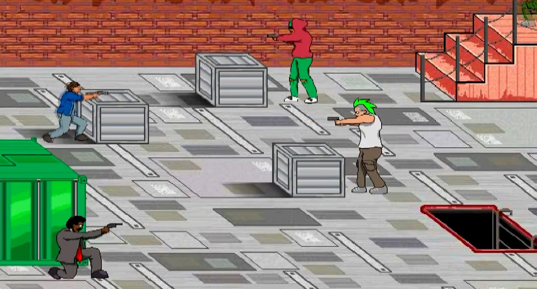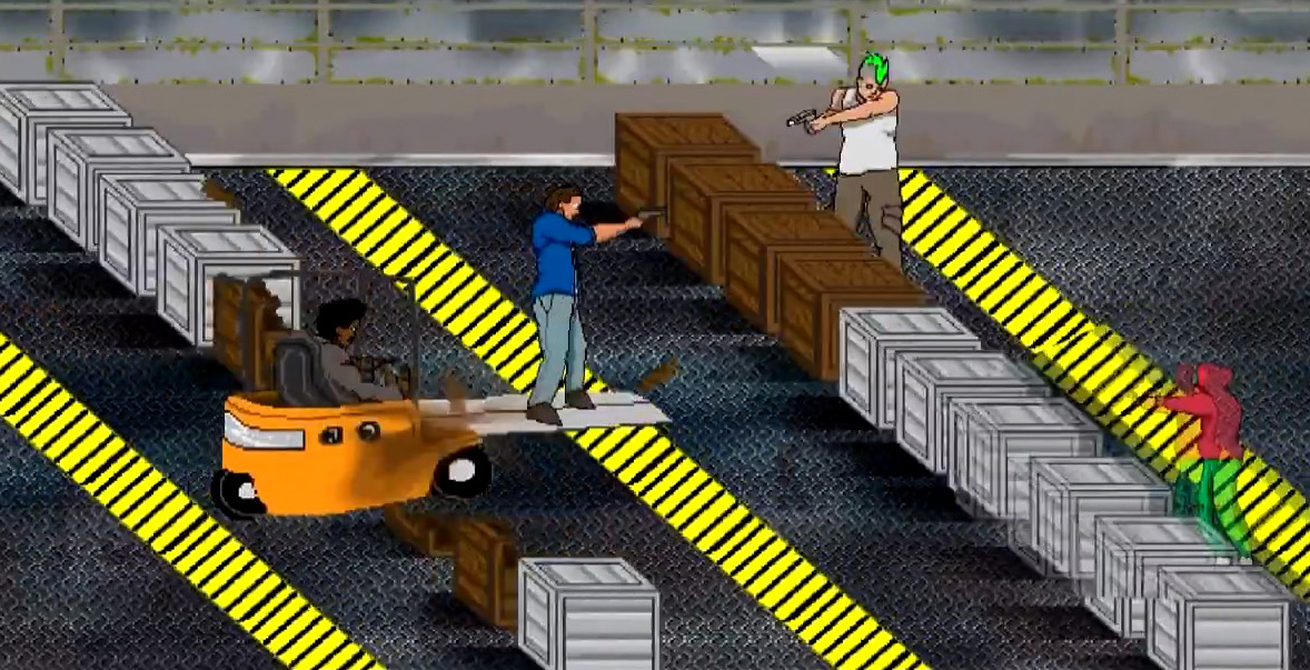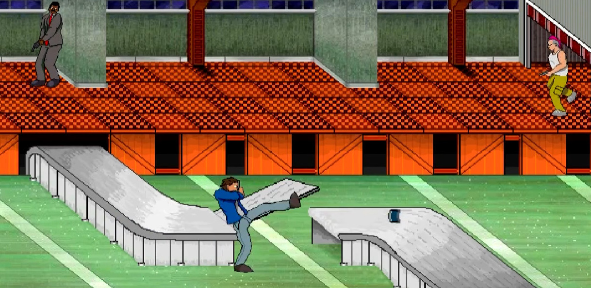 one of the thugs has been dealt with and john gets some ammo. the turquoise mohawk is also focusing his attention on the upper level, so john legs it towards to land a kick on the brown hoody thug.