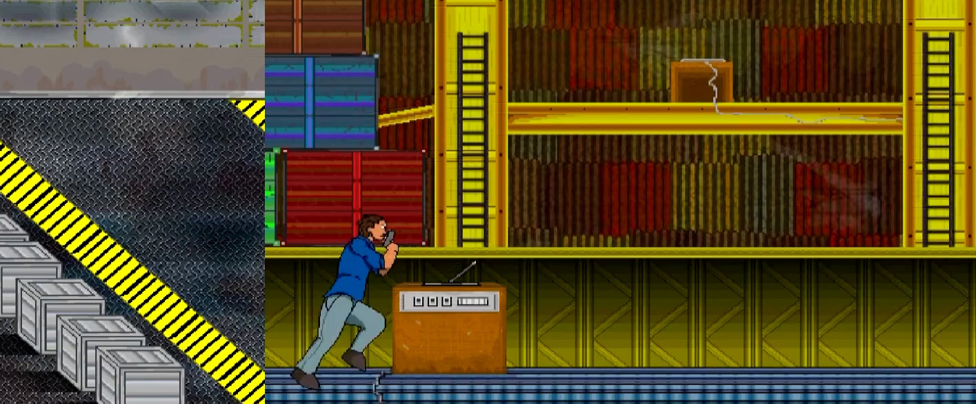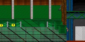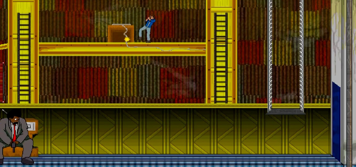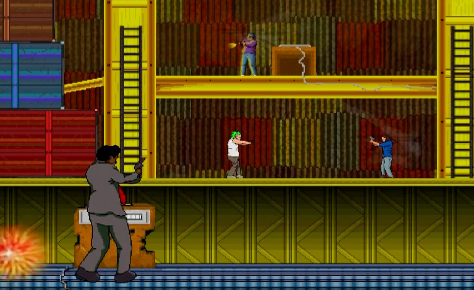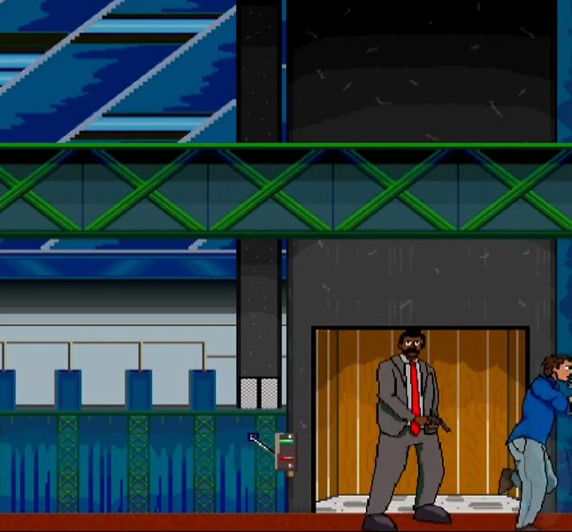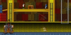 speaking of illogical spawning. foreground baddies are coming from the upper left girder, and reappearing on the bottom right playing plane. thought it was nice and flashy to see them walk in like that. my original intention however was to have john shoot up and down them. alas, I never got round to vertical aiming animations. only isometric up and down ones.