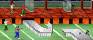 ugh yes, attack of the clones. so basically, I have two varieties of bad guys and 3 palettes for each one. and as I mentioned before, I can’t actually have two types of the same bad guys (example, what you see on the screen here. two hoodie thugs) in the same flash file, because they share similar data. whenever I tried and have two, they would share frames and even renaming the folders and frames didn’t make a difference. so in the end, I made about 3 or 4 flash files per level to accommodate the number of bad guys I wanted on-screen, then I would mask the videos together.