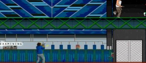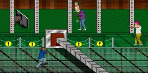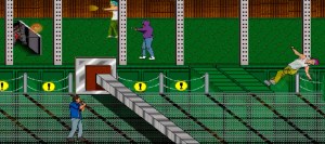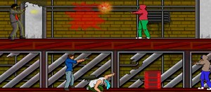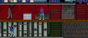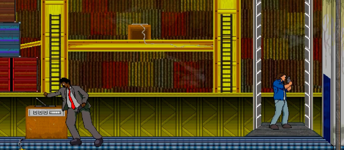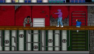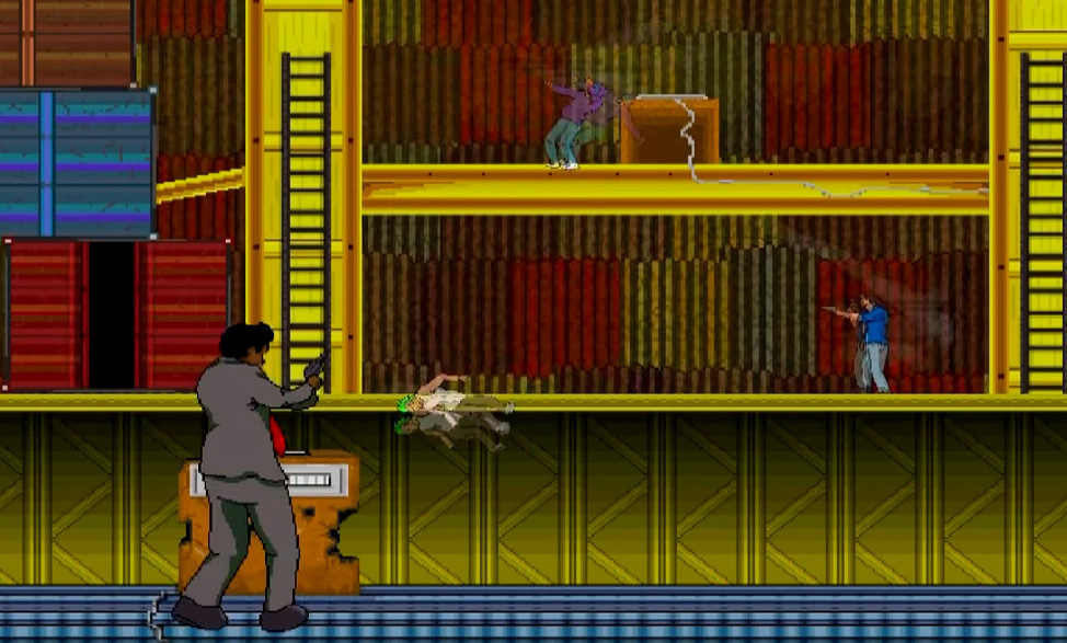 while the black cop is in cover, a narc walks by and only spots the cop on the lower levels. traditional game logic dictates that whoever has higher ground has the advantage. better field of vision and such. this also applies to the player. in many circumstance, the top cop will have a better angle for shooting baddies on both floors. you`ll see this at play in later levels.