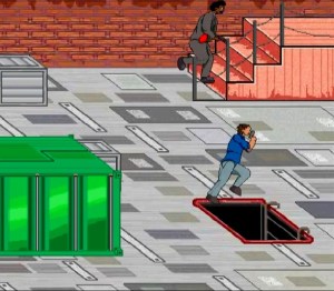 john is out of sight so he`s attempting to sneak up behind the thug who has Trevor pinned down. I was originally going to have a fade mask on the bottom floor. there would be a fuzzy see through area of bricks, to show that john is `underground` and hidden. but a fuzzy, alpha mask in flash is something i`ve never gotten to work. may have been too visually confusing anyway.