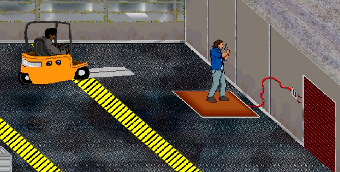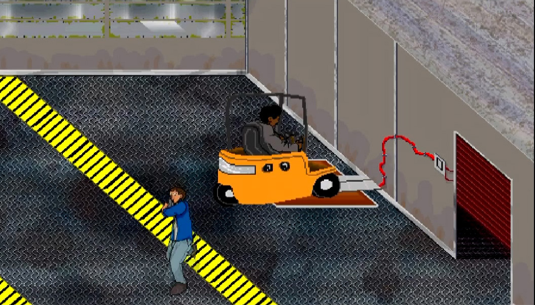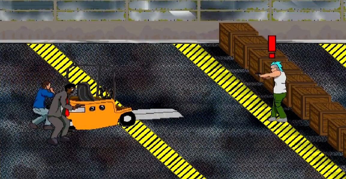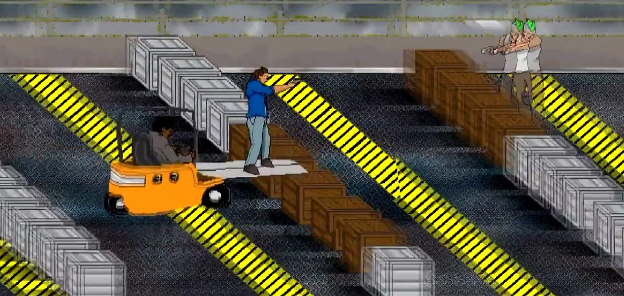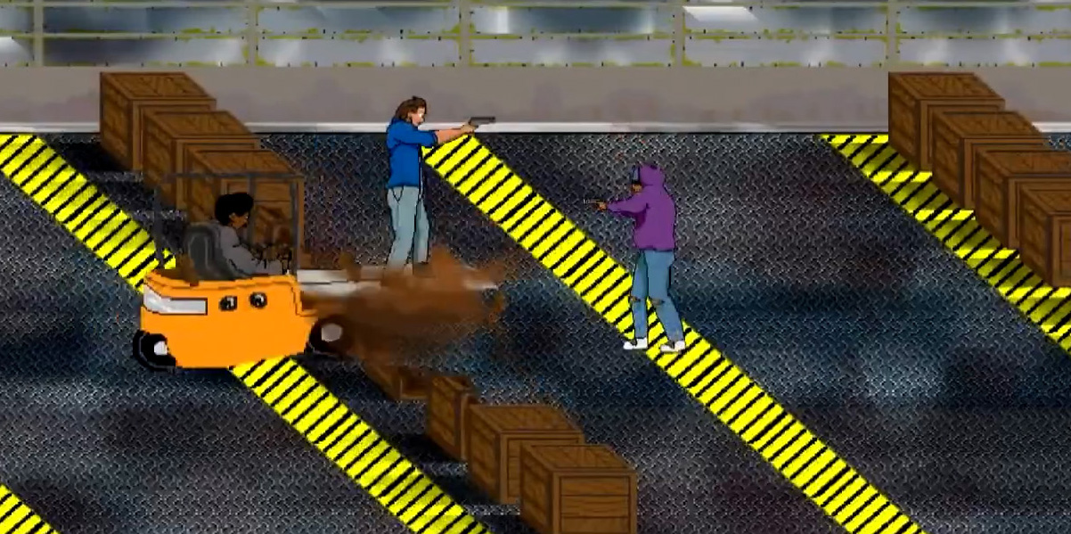 but he is greeted by the sound of the sight of the forklift destroying the precious cargo. most likely drugs or some other illegal contraband. he takes aim but soon realises the hopelessness of the situation, being squared against the two manned metal monstrosity.