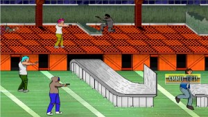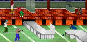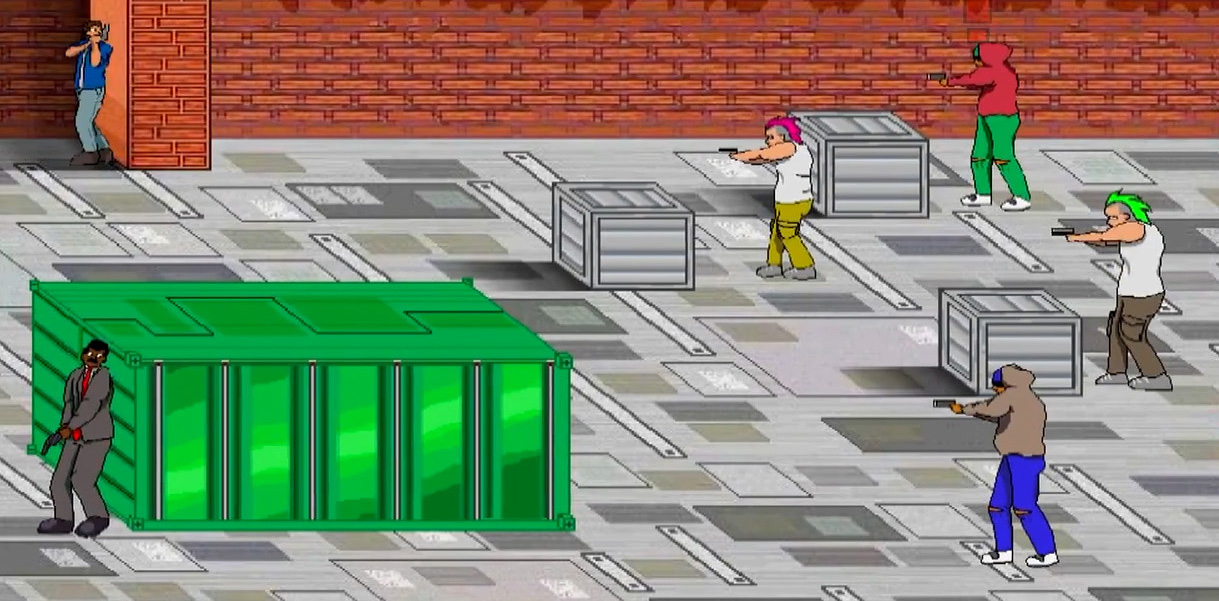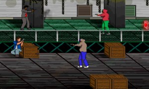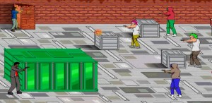 anyway yeah, the screenshot. here, the thugs are destroying the cover (destructible cover has about 10 different frames and an explosion animation to mask the transition) and the cops are peeking out from cover to fire back. this whole, taking cover and firing back dynamic is very modern. in most sidescrolling shooters cover is negligible since characters can usually jump about 10 feet. but since this concept has a more realistic edge, i`ll be having none of that.