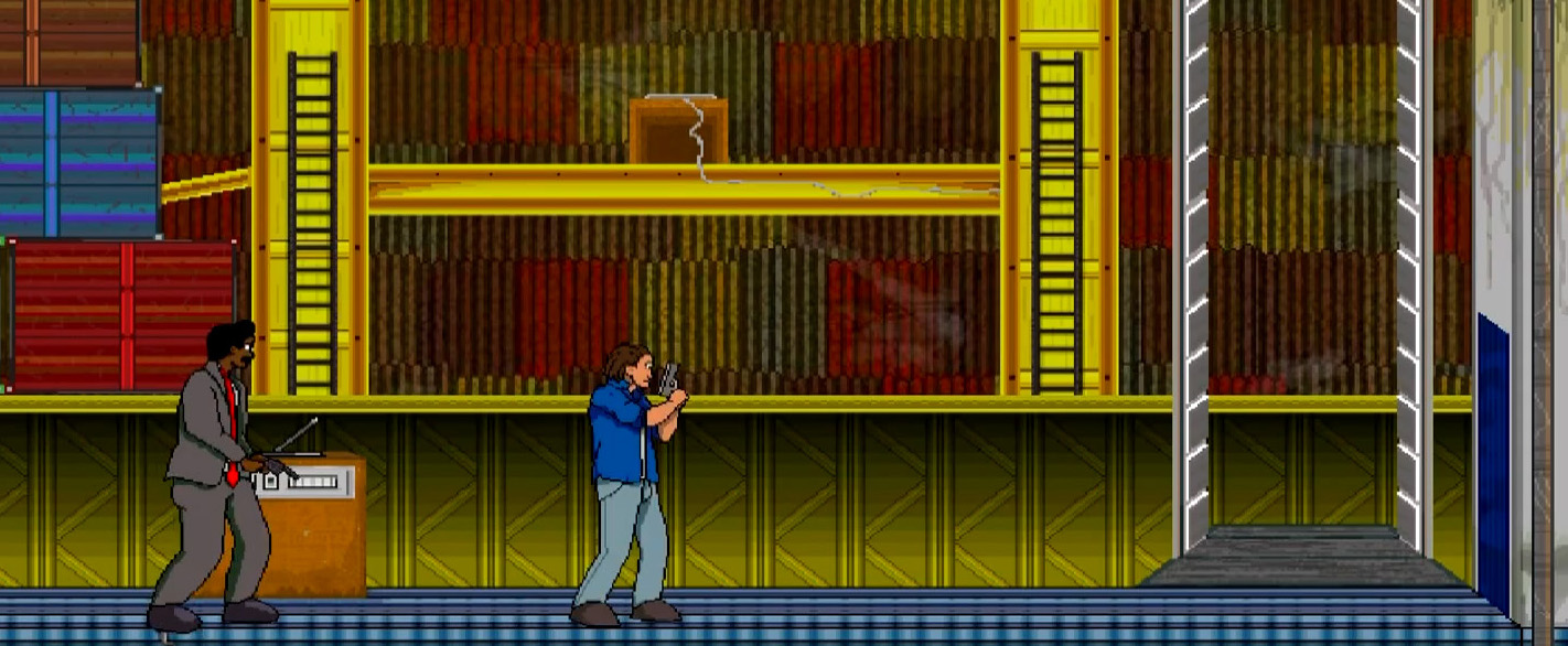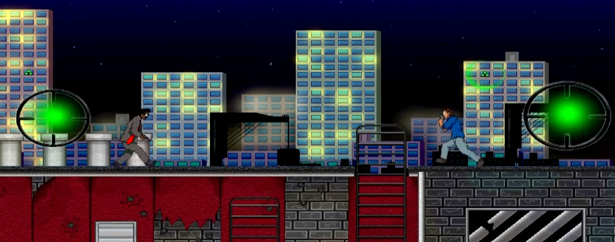gunshots from characters create a mask of lighting over them which fades over the course of three frames. the bullets also create a HD spark when they hit something. the `fading` animation of bad guys is something that couldn’t be done on a small resolution as the pixels have smooth tween motions where they shrink and grow. something like an enemy death deserves a flashy (semi-HD) moment, as a payoff.