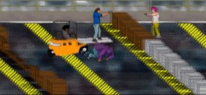 two more lanes of boxes to go.there are three states of animation that forklift. neutral/up/down. the only negligible difference is that the steering wheel,trevor`s position and the wheels turn slighty. I should have drawn the forklift from three angles. but the things are difficult to draw. almost as hard as drawing guns, but at least the guns are about 5 pixels in this.