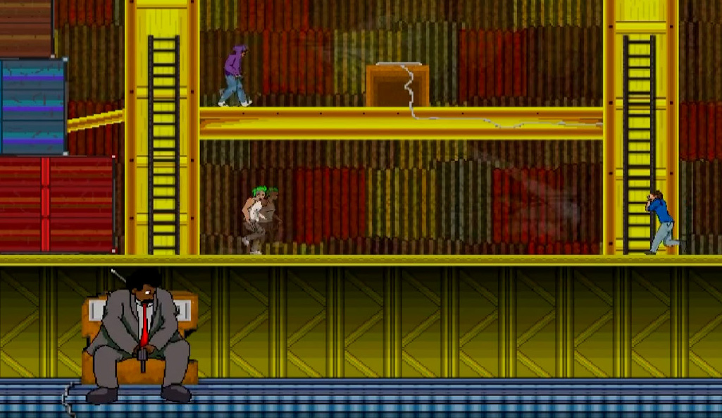the brown boxes in the path splinter and combust as the pink mohawk futilely attempts to run away.one thing I didn’t plan for in the level design is the verticality of the combined cops. his head goes offscreen more than once. unfortunately there is no more art that high up, so he gets clipped.