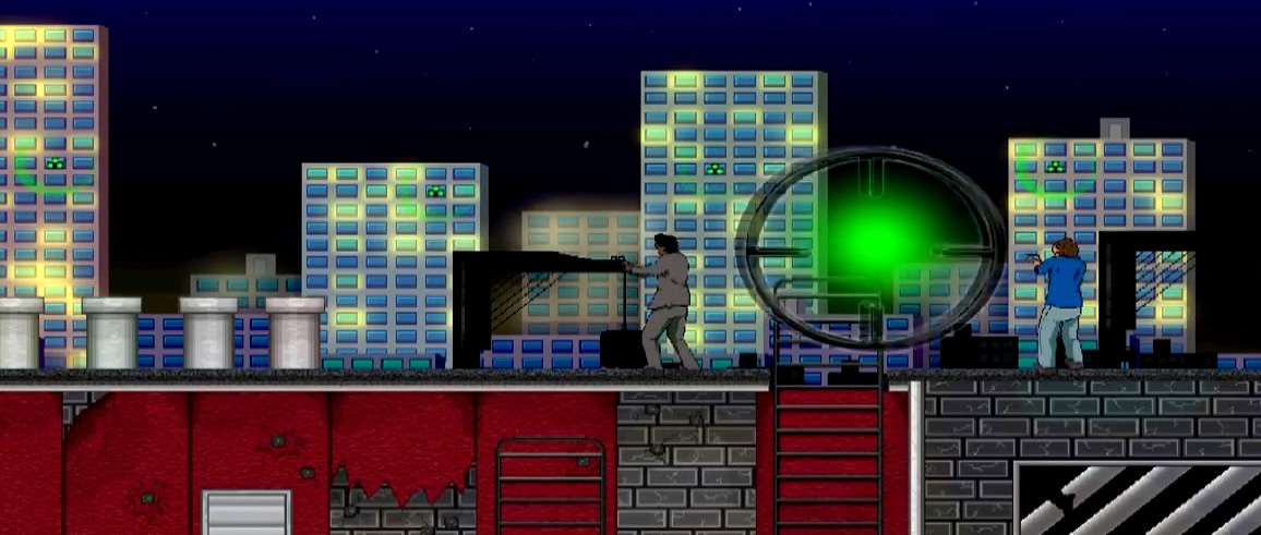 once they both get up, 4 green lights appear from various building windows, and then a crosshair tries to hover over them.so they take aim and shoot towards the buildings.
