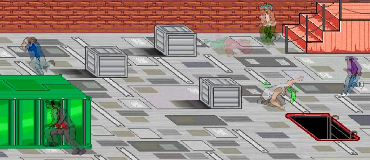 and then they both run to their respective exits. I painfully have Trevor go down and then up, because halfway through animating it I realised I needed him to be on the top floor, when I originally had him at the bottom side of the crate.