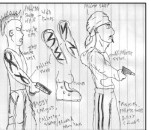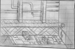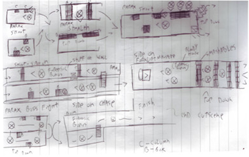 this next room was a pain to storyboard because it was really long and I left the camera motion in untill last. this is essentially the main set piece of the whole game. when they first get in the room, they take cover behind the forklift.