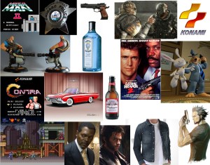 the portrait in the background with a score overlay is derived slightly from the score screen at the end of SNES contra.