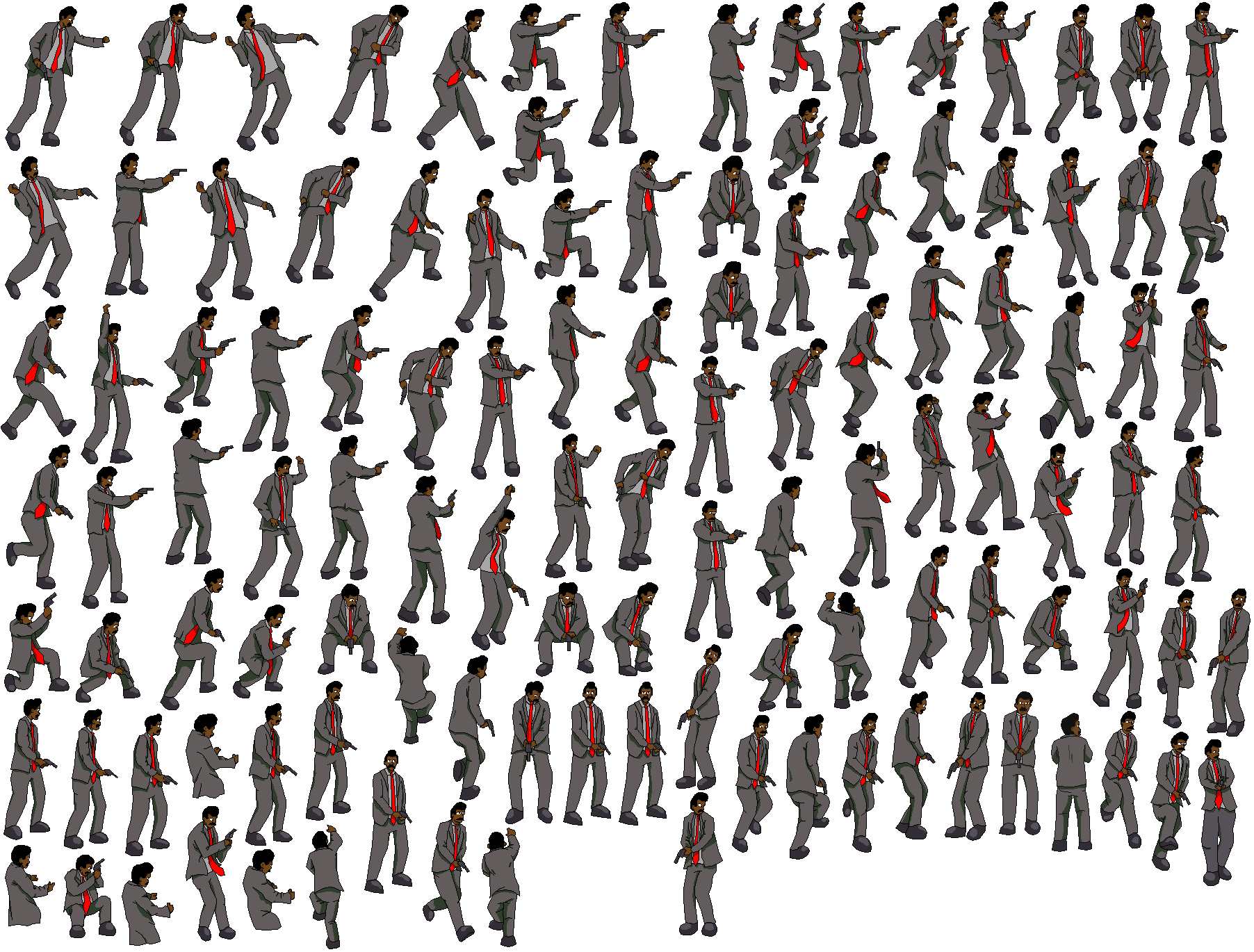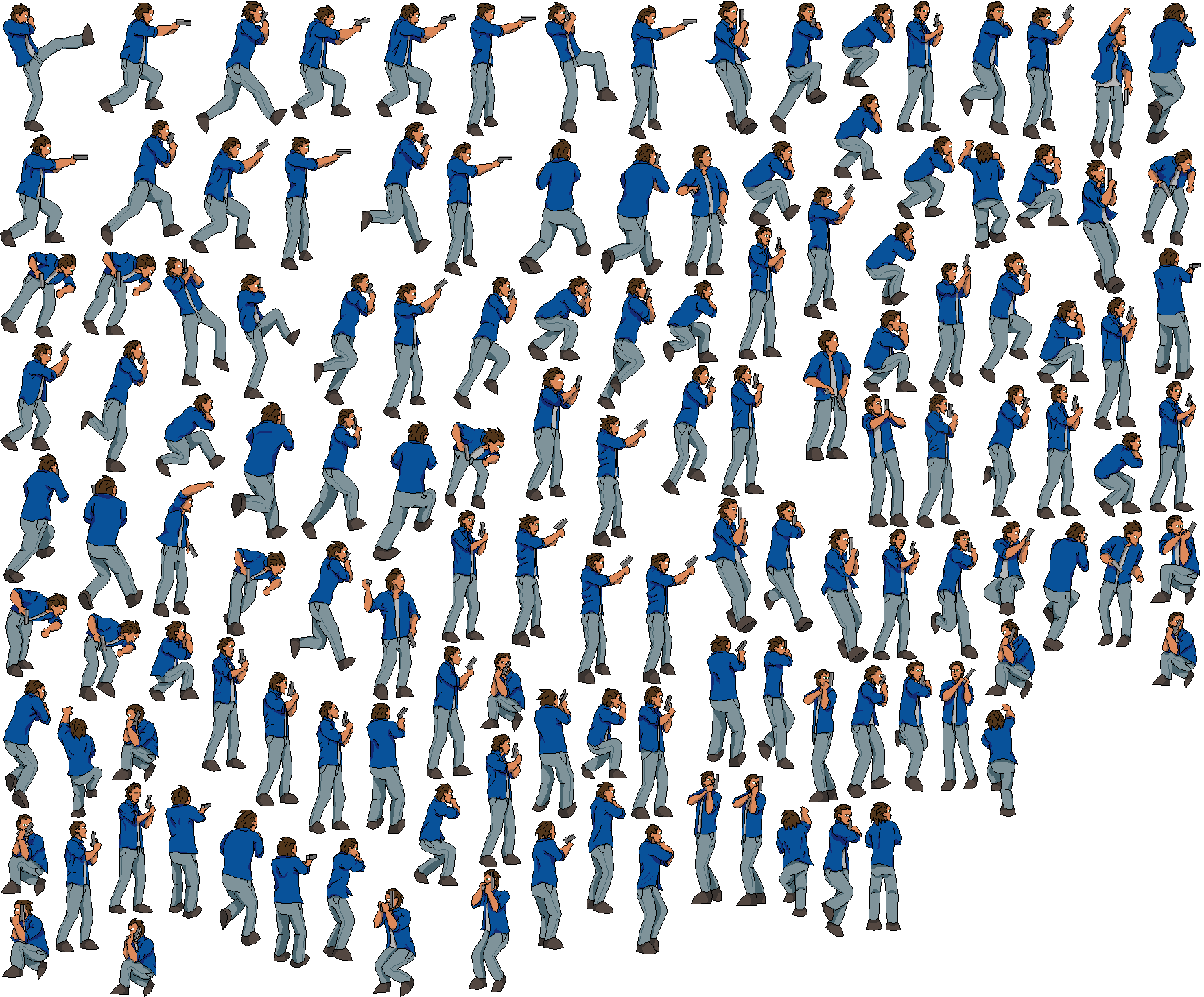 they have taken them down. you can see a yellow sheen on the bottom cop. for the firing frames, I made copies of their original frames. increased the size, and made a lighting overlay for them. that yellow sheen is very high-resolution, but it wont detract from the retro element because it only appears for a split second (3 frames to be exact) but when it is glimpsed, it looks nice and compliments the sprite.