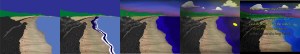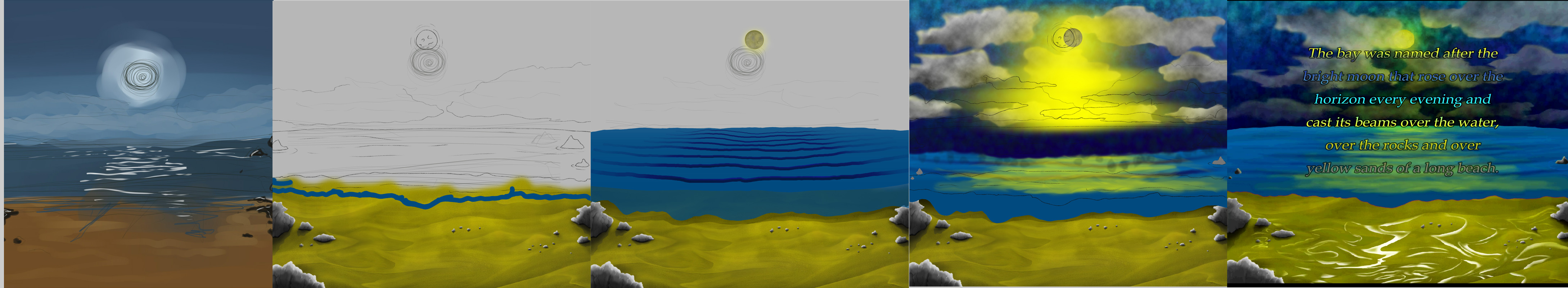 the first draft of the final scene simply had the waves splashing in and out, with little starry twinkles at the shoreline. however, the feedback indicated that we needed to show the rocks on the beach with the green trademark seaweed, so I got to work on revising it.