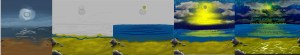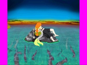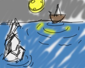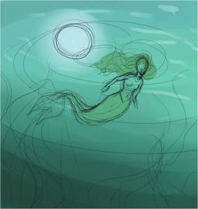 the intention was to have the mermaid looking at the rocks sticking out from the ocean surface, with the sandy beach being luminescent via the moonlight. But this changed due to feedback.