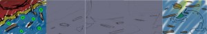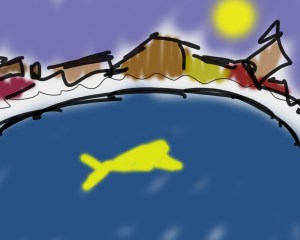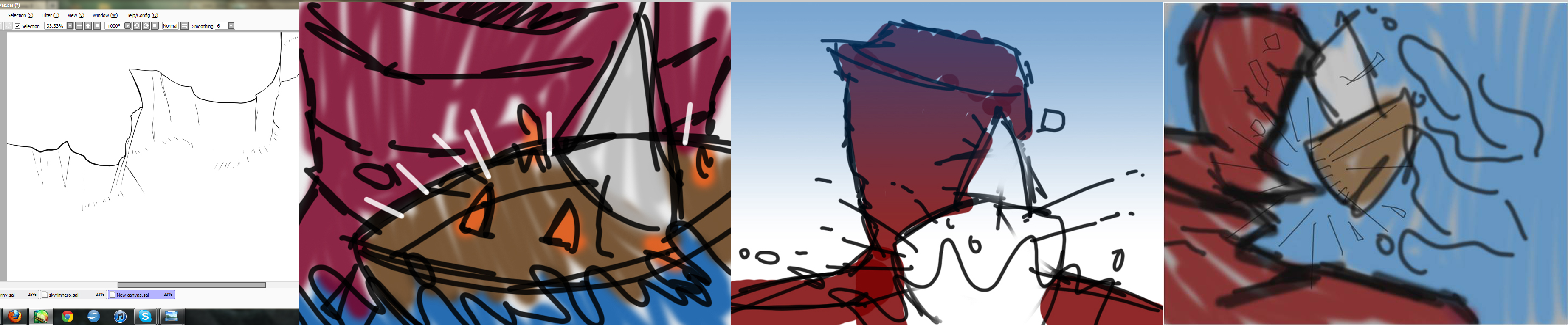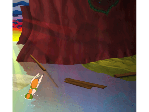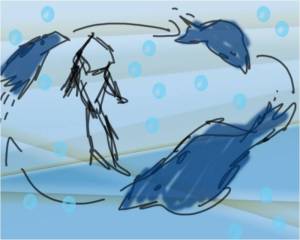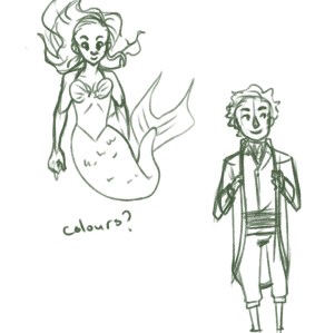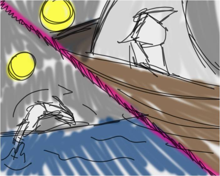 if you can decipher this mush, it`s meant to show the mermaid sitting on a rock with the sailor sobbing and her colour going into the water. kind of same layout as scene 2`s first version, but i was determined to do it better.