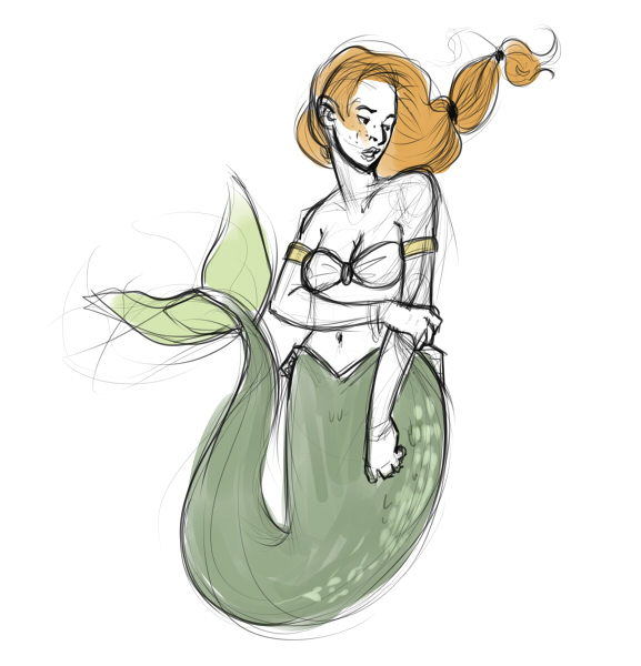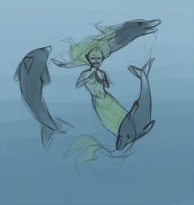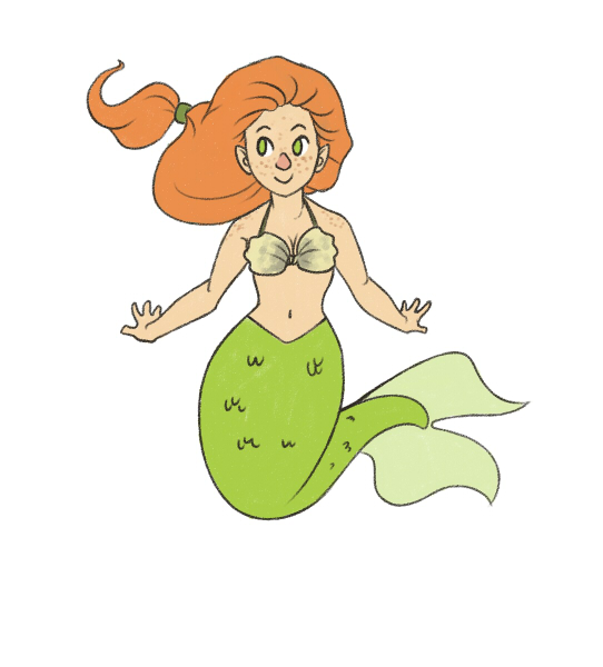 for the younger mermaid design, I coloured and animated that version just give Davie an early draft. Becca did the final version. our animation technique for this project, was to have every body part joined. but animating at a different speed/rate. when all body parts are changing in sync, it makes it look as if the entire thing has been redrawn. but different body parts all moving independently gives it a more organic flow, or so I feel. watch the video at the end and judge for yourself 🙂