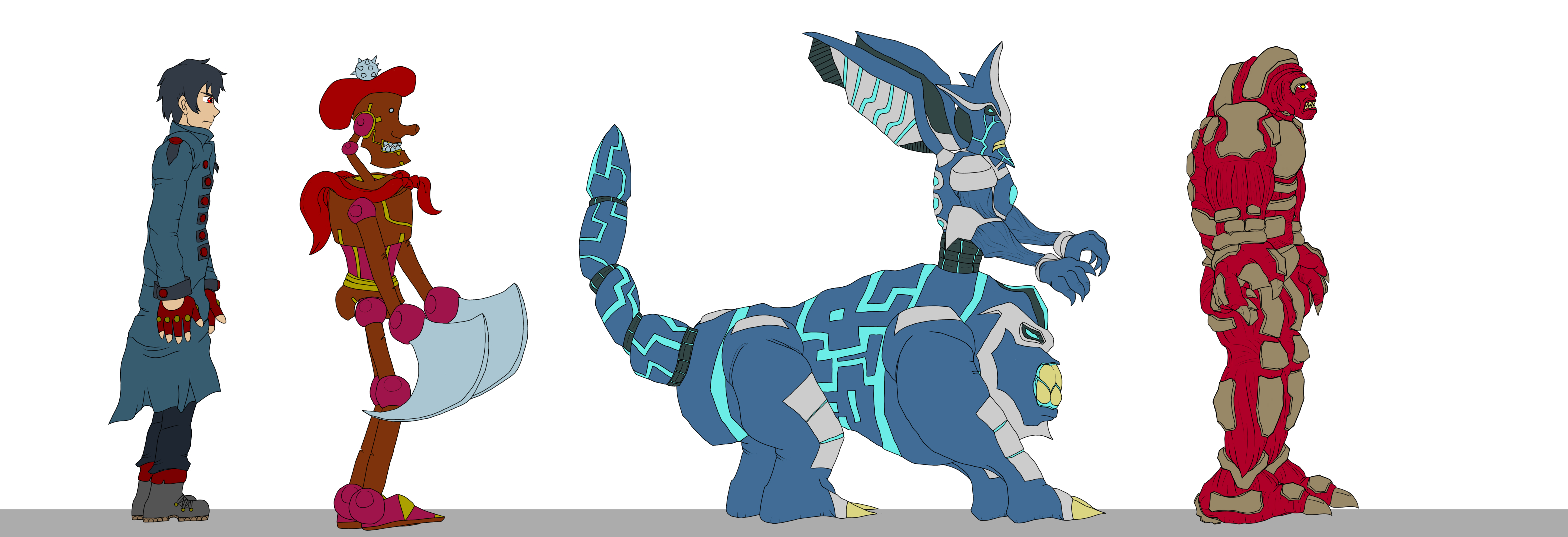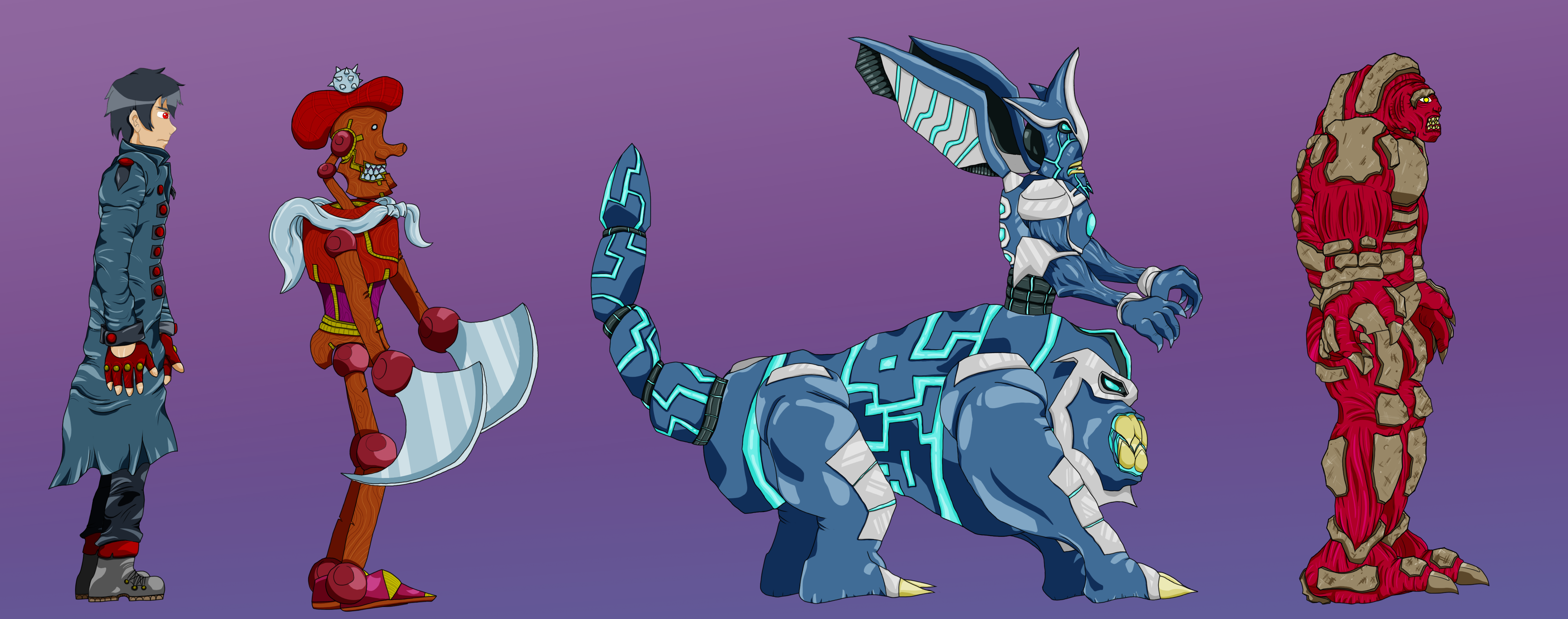 He had ideas on which to base his characters on. The inspiration for the mannequin was the enemies from devil may cry 1, the hybrid creature is Omega weapon from final fantasy and the meaty brute is from gears of war. The main character is revised from a sample image he provided at first.