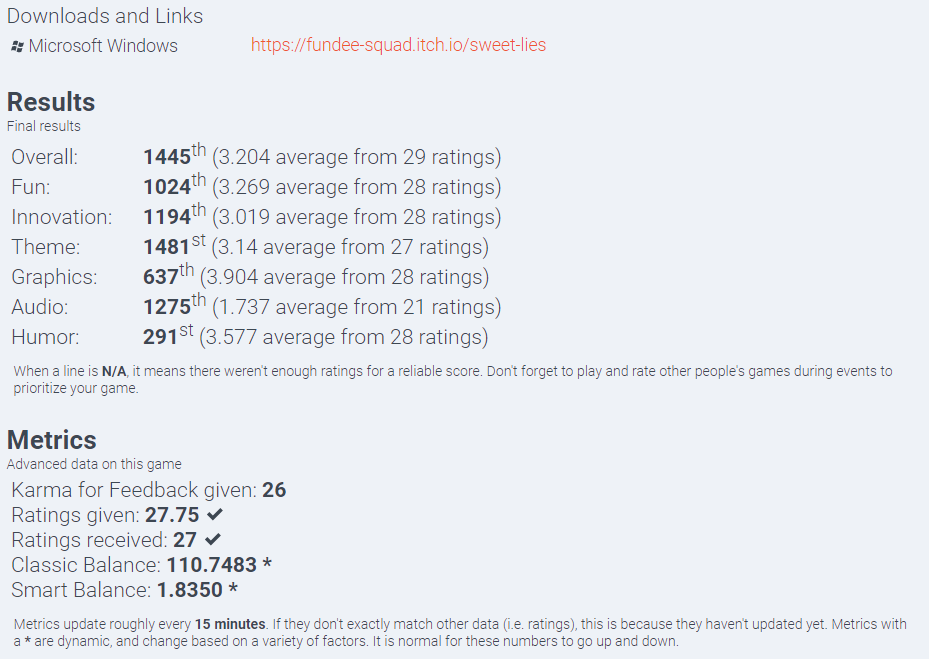 The rankings came in for the sweet lies gamejam we did. Our rankings are fairly good. In the top 1000 for a few categories. (Namely graphics which I’m super chuffed about)