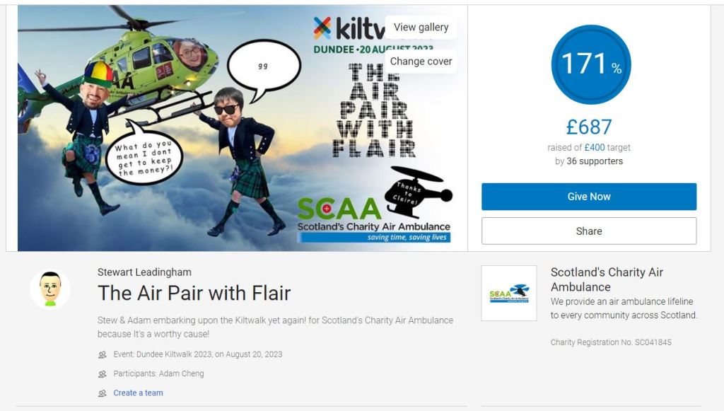 We’re ambitiously taking on 2 Kiltwalks for 2024. Dundee & Edinburgh. The Justgiving page and promotional assets are still in development. We have a goal of £1000 to reach for this time. More updates to follow! Same charity and duo.