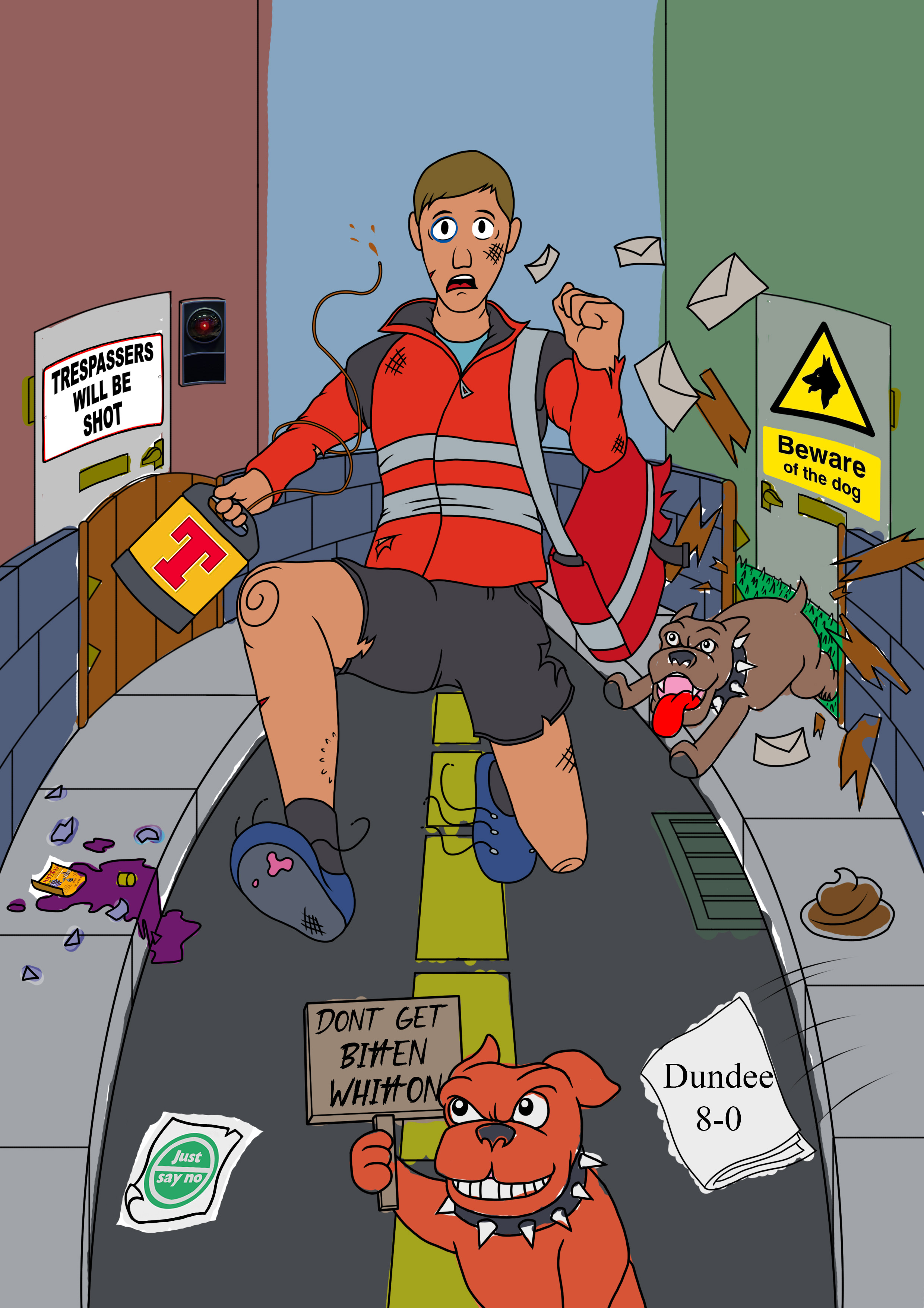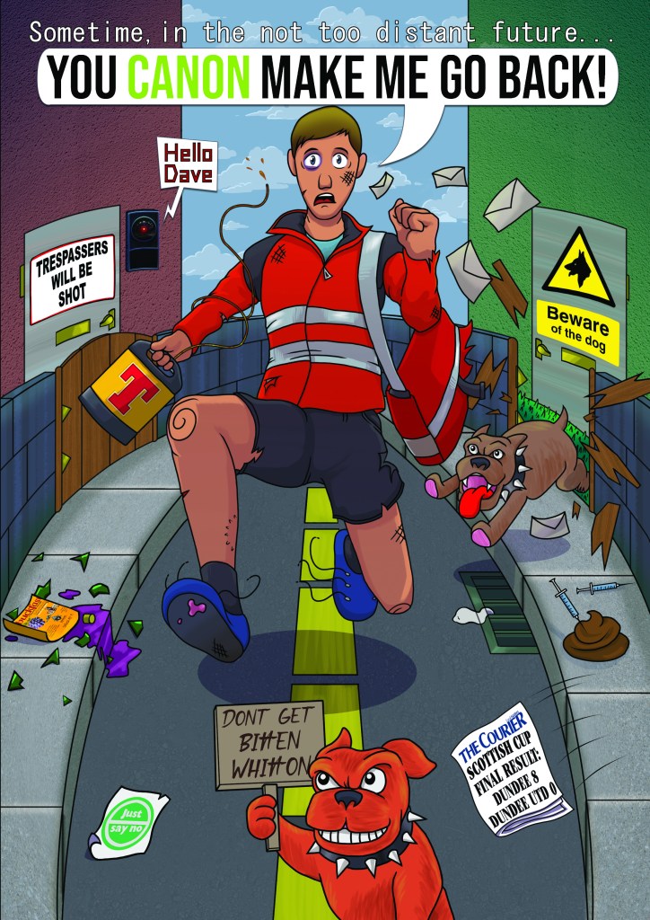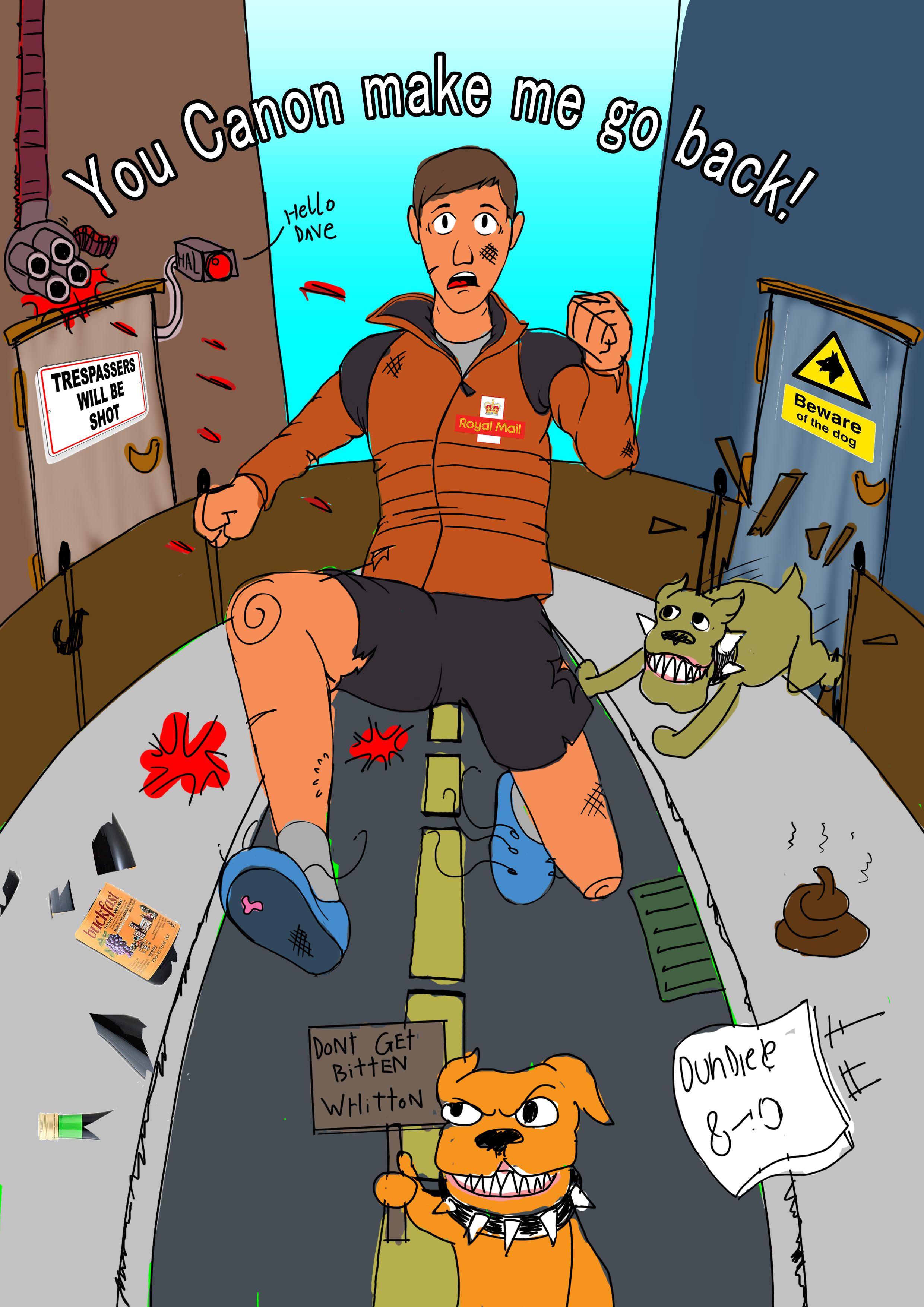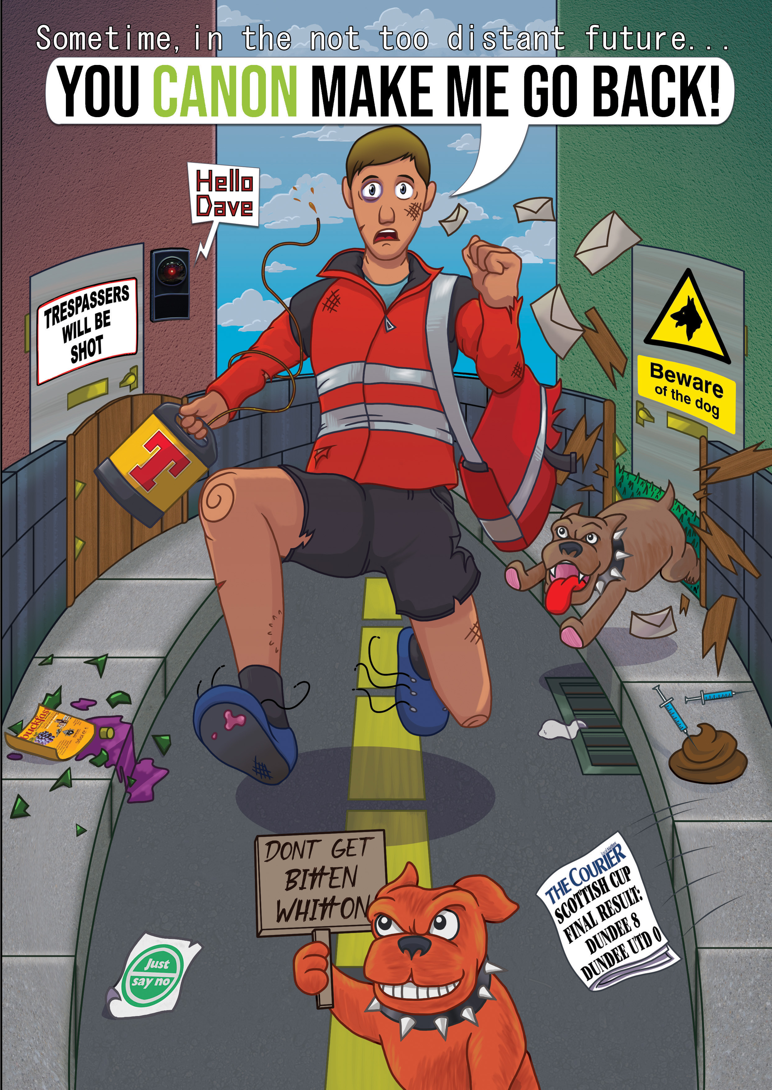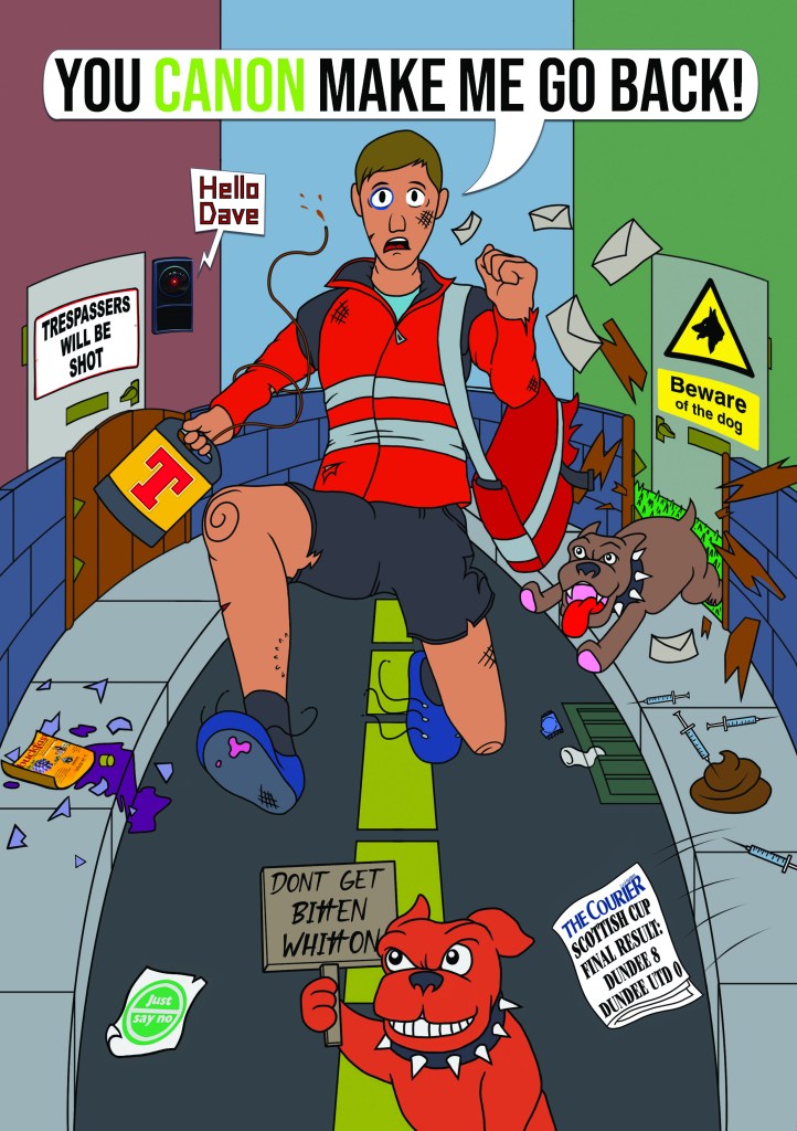 Lots of Dundee themed easter eggs in here. He’d been employed for 8 years hence the football score. A 2001 space odyssey joke since video doorbell + being named Dave. A cheeky keg of Tennent’s to help get through a tough shift of dodging dogsh*t and drugs. The machinery he operated was called the “Canon press” hence the speech bubble. Quite proud of that one 🤓.